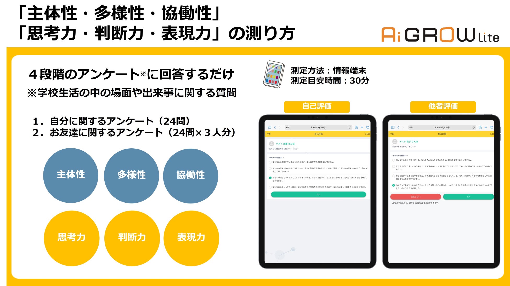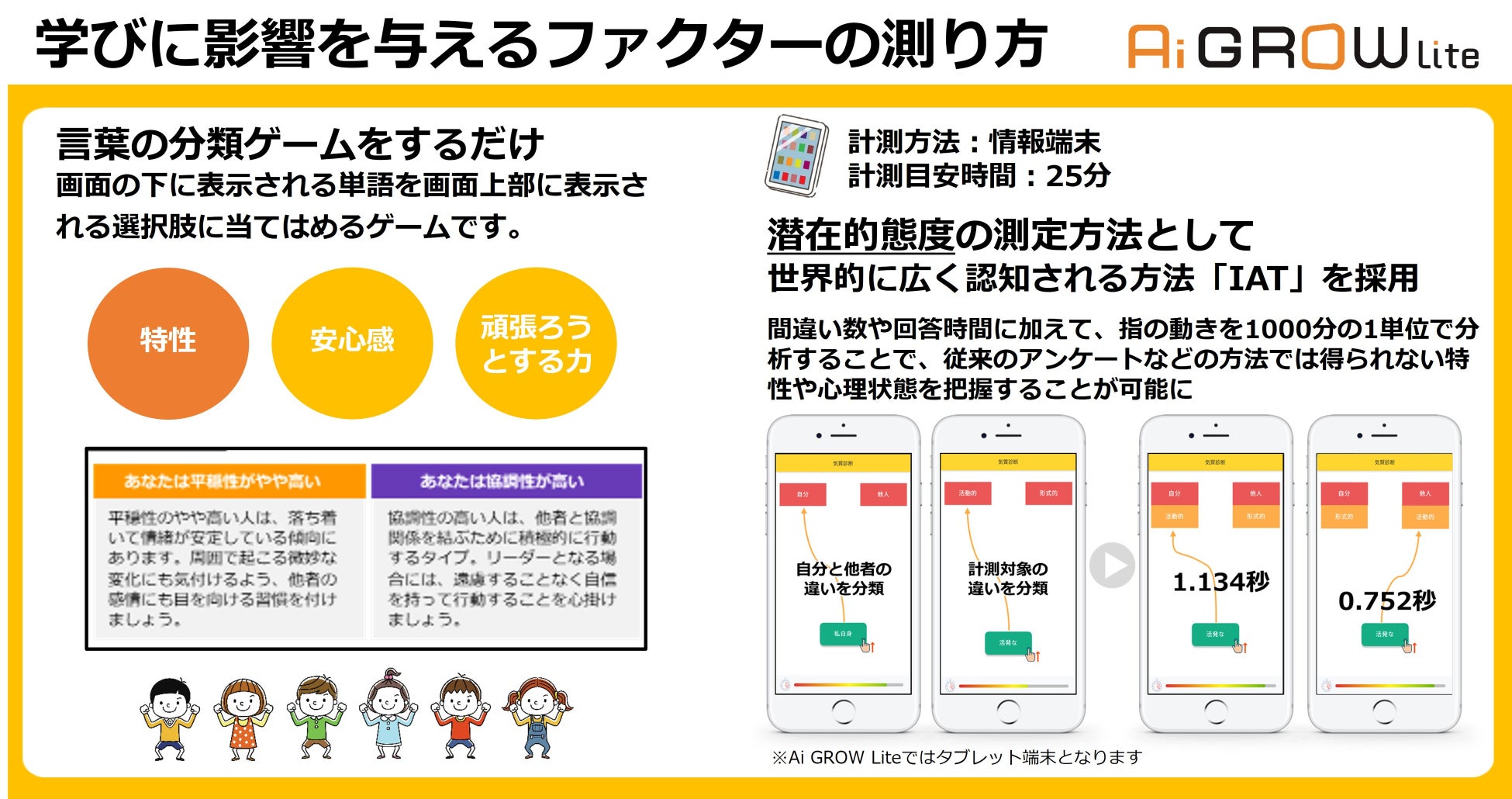 「Ai GROW Lite」では、非認知能力や学習に影響を与える特性、心理状態を可視化するため、1億3千万件以上(※1)の評価件数を誇るIGSの評価技術を活用し、①「主体性・多様性・協働性」・「思考力・判断力・表現力」の6つの能力、②「特性(気質)」・「心理的安全性」・「グロースマインドセット(※2)」が測定可能です。