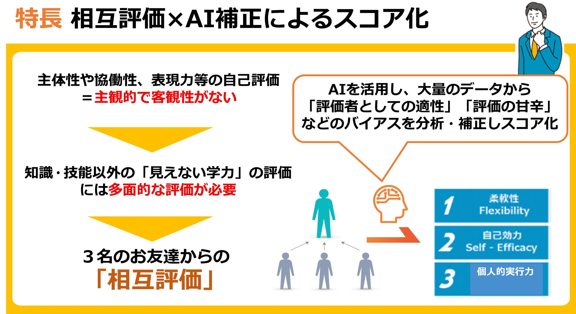 人が人を評価するうえで生じやすい、忖度や性格の甘辛などの不要な評価の偏りをAI(人工知能)が補正することで、児童・生徒の能力をより公正に可視化することができます。(特許第6589257号)