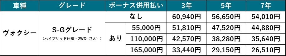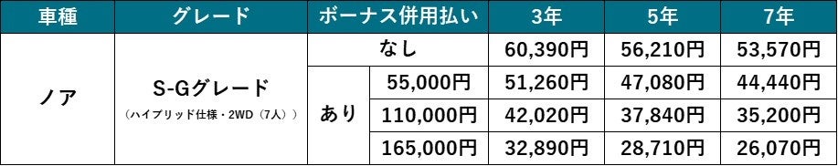 - ※¹ いずれもハイブリッド仕様・2WD(7人乗り)、最安値パッケージ・追加オプション無し。「初期費用フリープラン」の7年契約、ボーナス月加算165,000円(税込)設定の場合。7年間の総支払い額は、ノアは4,499,880円、ヴォクシーは4,536,840円。