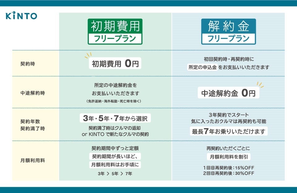 KINTOでは、昨年12月に、支払い方の新たな選択肢として、「解約金フリープラン」を追加し、既存の「初期費用フリープラン」とあわせて、2つのプランからお選びいただけるようにしています。