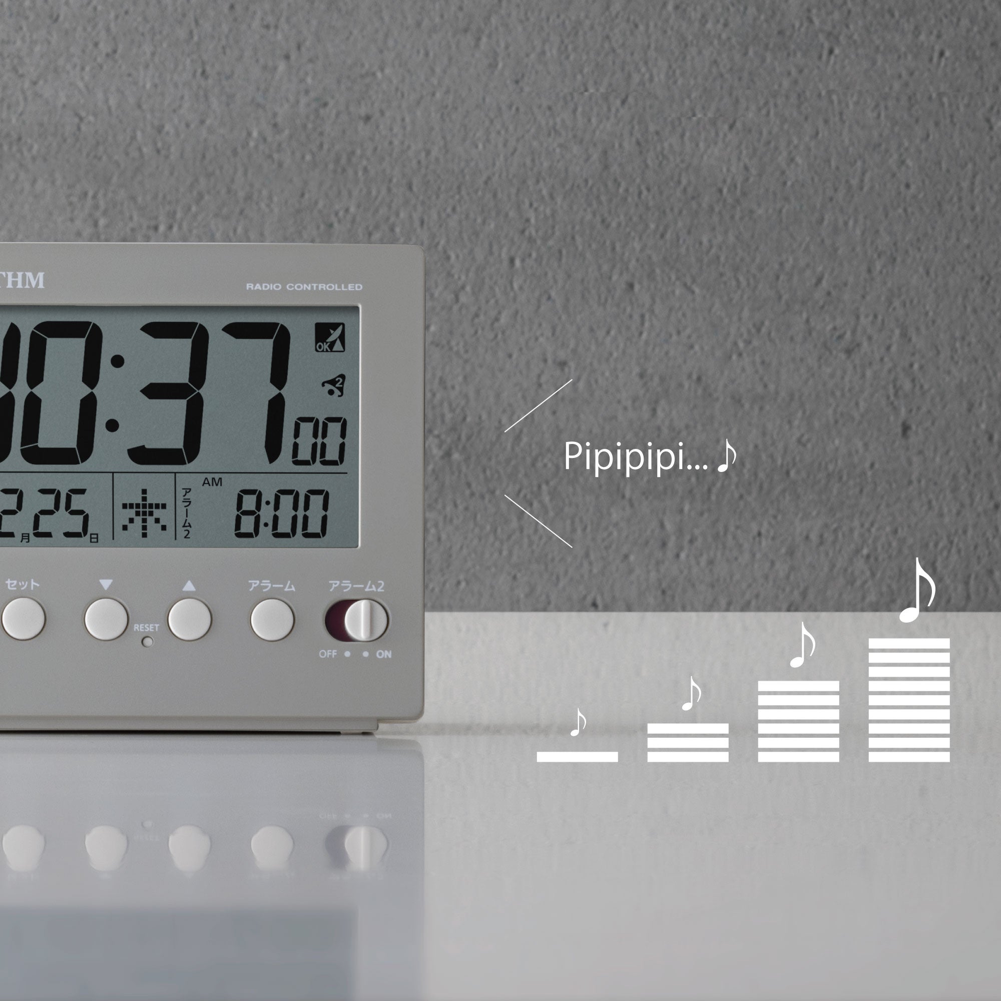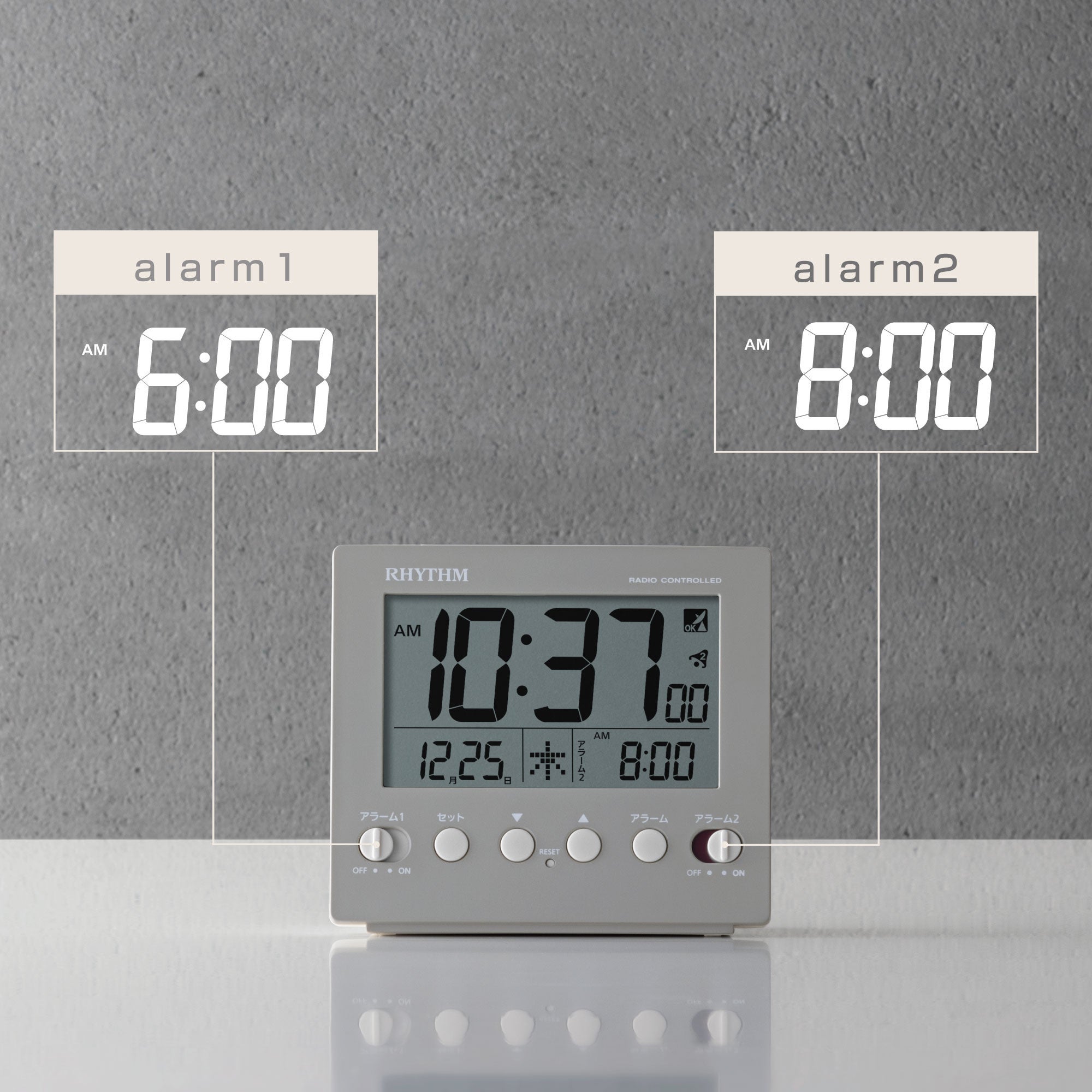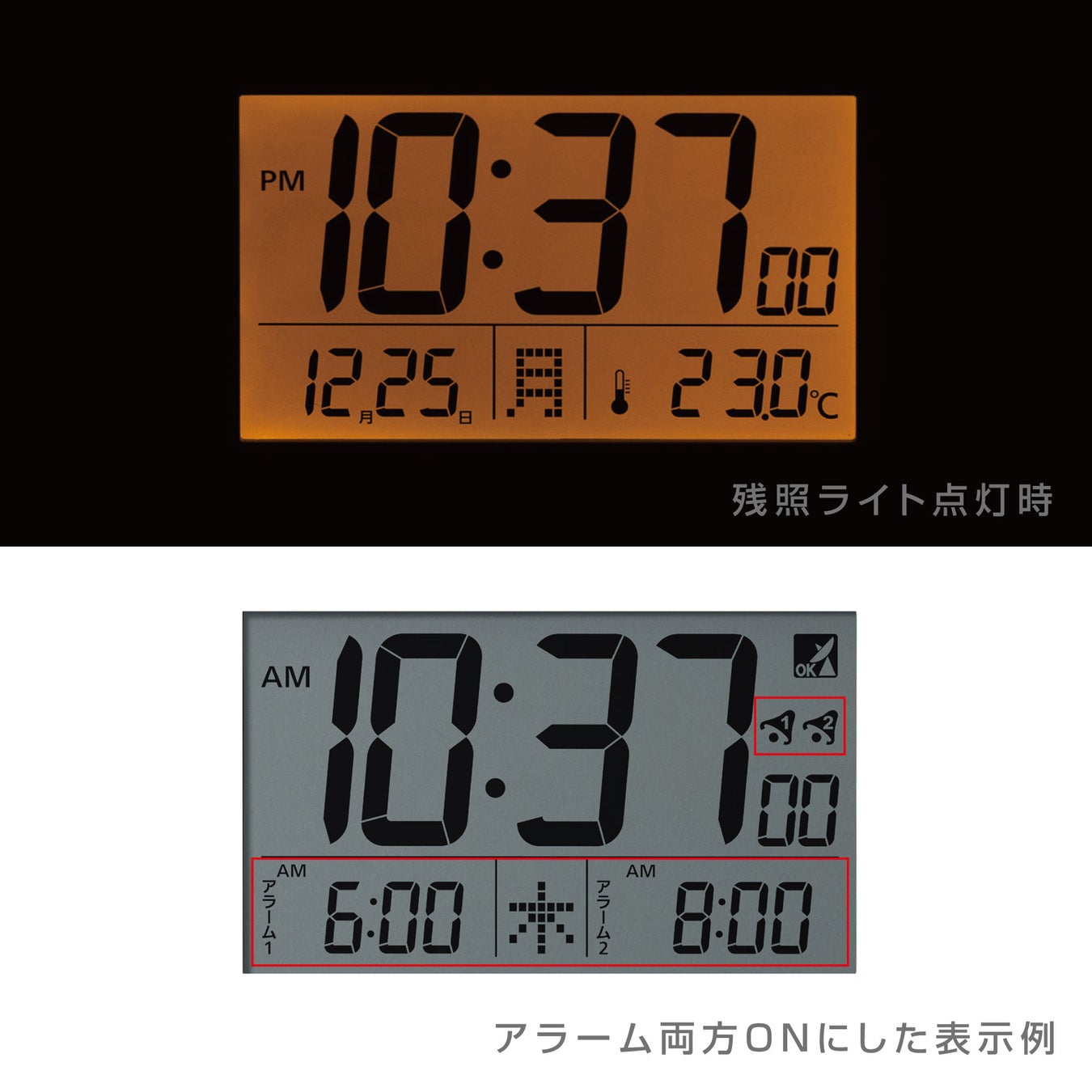 アラーム時刻を2種類設定できるダブルアラーム機能付き。