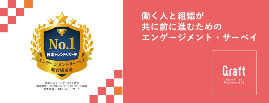 人材の“採用”から“定着”、その先の“活躍”までを支援する人材サービス事業を展開する株式会社ヒューマネージ(本社:東京都千代田区、代表取締役社長:齋藤 亮三)は、エンゲージメント・サーベイ『Qraft(クラフト)』が、日本トレンドリサーチ(運営会社:株式会社NEXER)によるインターネット調査実施の結果、「エンゲージメントサーベイ 総合満足度」において第1位に選ばれたことをお知らせいたします。