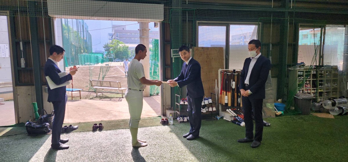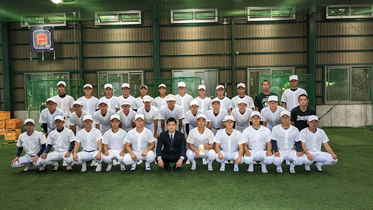 当社代表取締役、河田憲二の母校である船橋市立船橋高等学校。高校在学中に所属した野球部に、ティーバッティング練習用のネットを贈呈しました。