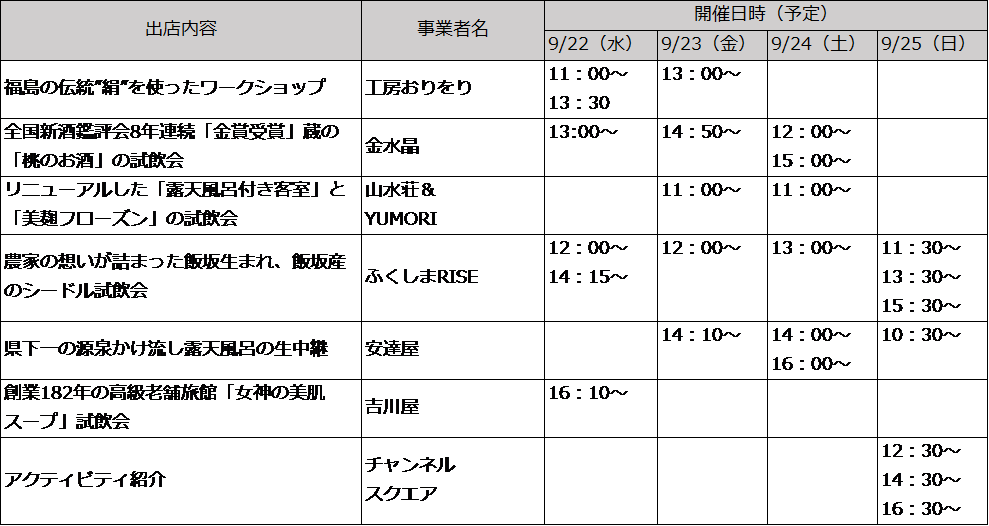 ツーリズムEXPO初出展となる福島市では、「暮らすように、旅をする」をブースコンセプトに、旅をきっかけに移住した女性たちのストーリーなど女性来訪者の様々な滞在の楽しみ方をご案内。さらに観光関係者による地産物の試飲・試食と販売、ワークショップなど来場者との交流を図る体験型ミニイベント企画を多数用意しており、当イベントにて福島市への共感を図り、関係人口の構築を促進します。