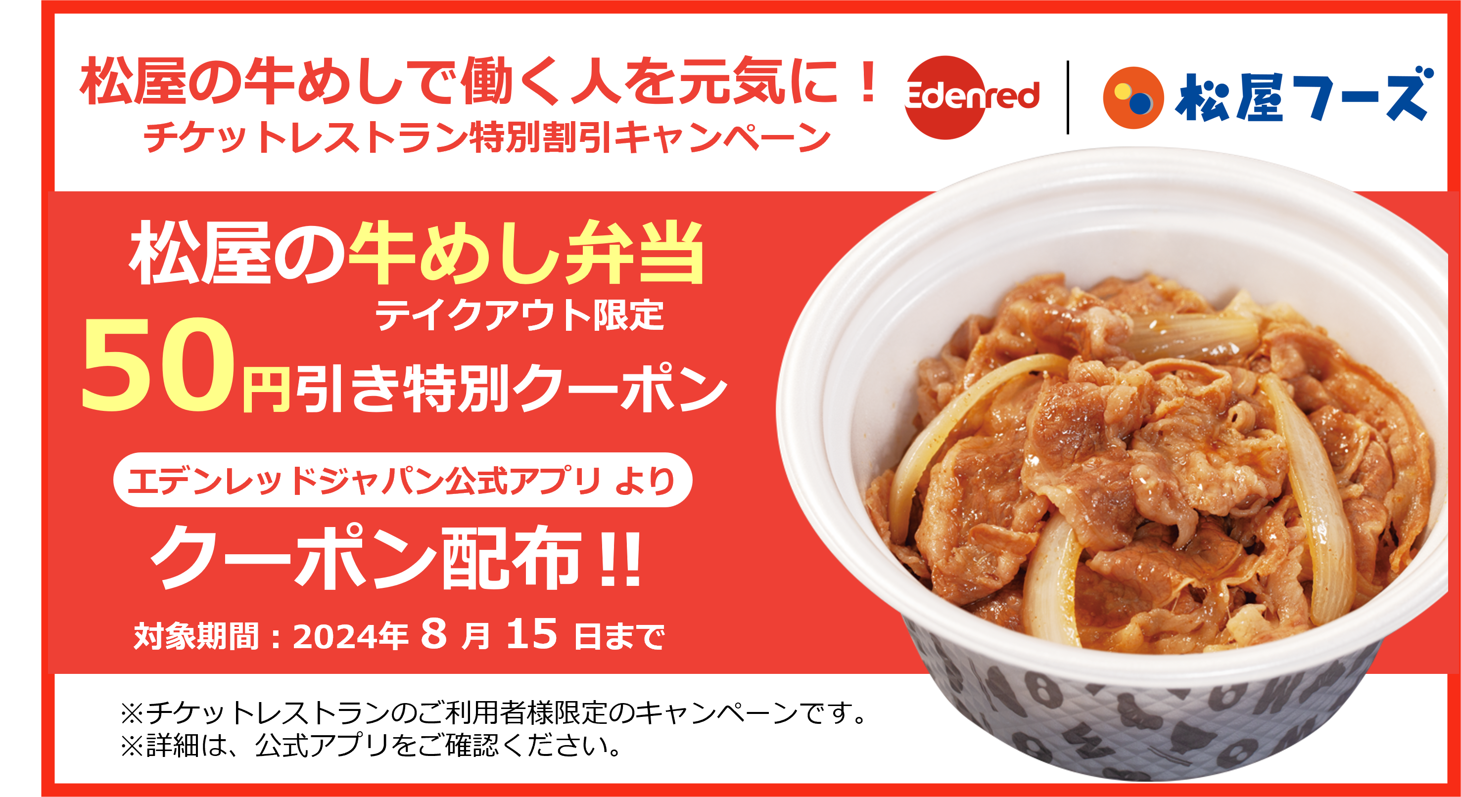 昨今から続く物価上昇が家計の大きな負担となっており、ビジネスパーソンのランチ代にも影響を及ぼしていることが当社の調査でも明らかになっています。経済的理由によるランチの欠食頻度が高まっており、週に1日以上ランチを欠食する従業員は4人に1人にのぼっています。さらに今夏は厳しい猛暑の日々が続いており、夏バテ気味で食欲が湧かないという方も多いことでしょう。そこで今回は、松屋様ご協力のもと、エデンレッドジャパンでは初の試みとなる公式アプリでのクーポンキャンペーンを実施することとなりました。人気メニュー「牛めし」が50円引きでお楽しみいただけるお得なクーポンを配布します。ぜひ松屋の「牛めし」で暑い夏を乗り切りましょう。