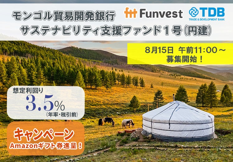 「未来をわかちあう投資」を提供する「Funvest(ファンベスト)」(以下、Funvest)は、「モンゴル貿易開発銀行 サスティナビリティ支援ファンド1号(円建)」(以下、本ファンド)の募集を8/15より開始しますので、お知らせいたします。