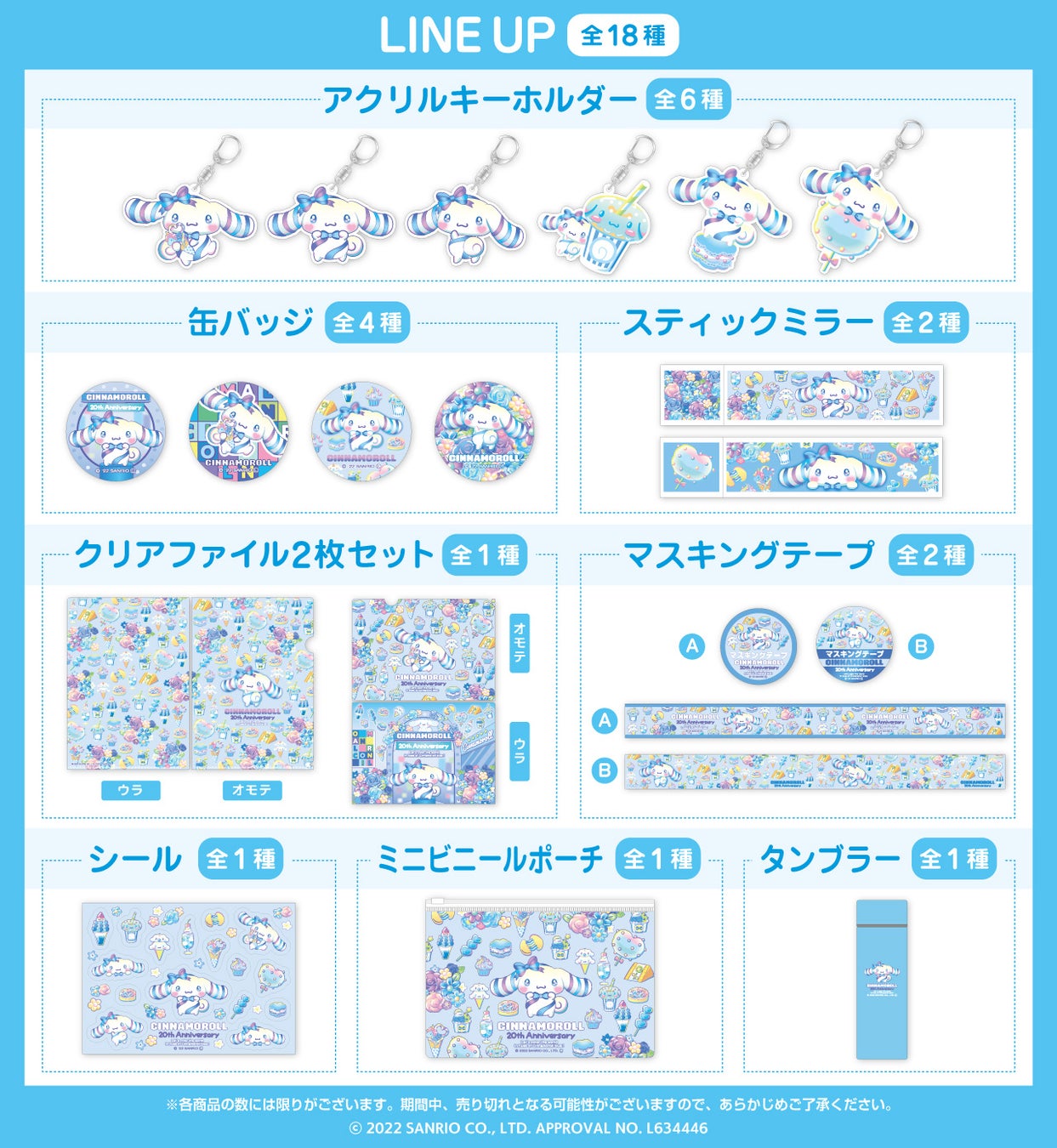 種類:18種(アクリルキーホルダー全6種、缶バッジ全4種、スティックミラー全2種、