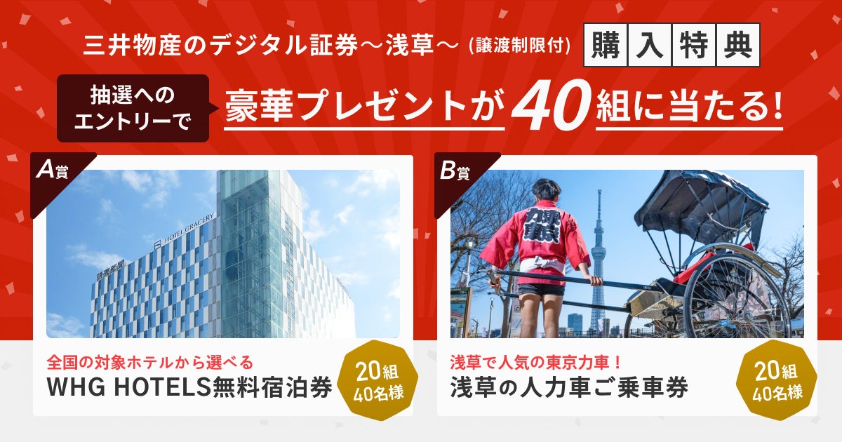 本案件を購入の上、所定の応募フォームからエントリーいただいたお客さまには、WHG HOTELS 選べる無料宿泊券や浅草の人力車ご乗車券(2万円相当)を「抽選」でプレゼントします。