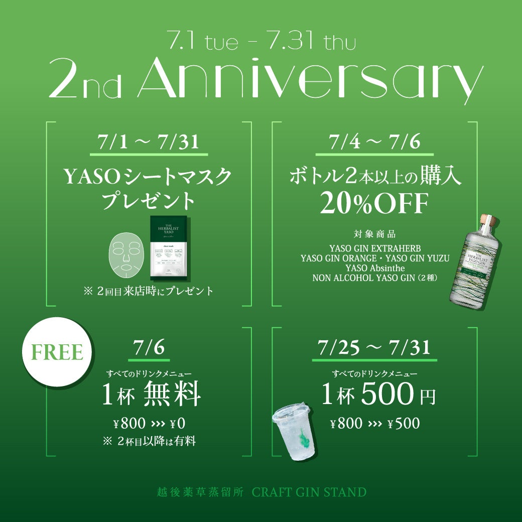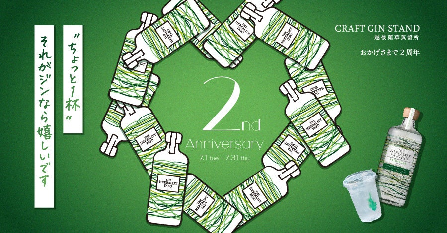 株式会社越後薬草(本社:新潟県上越市、代表取締役:塚田和志)は、表参道の「越後薬草蒸留所 CRAFT GIN STAND」で、開店2周年を記念し、2025年7月1日(火)から7月31日(木)の1ヶ月間にわたって「2周年特別イベント」を開催いたします。
