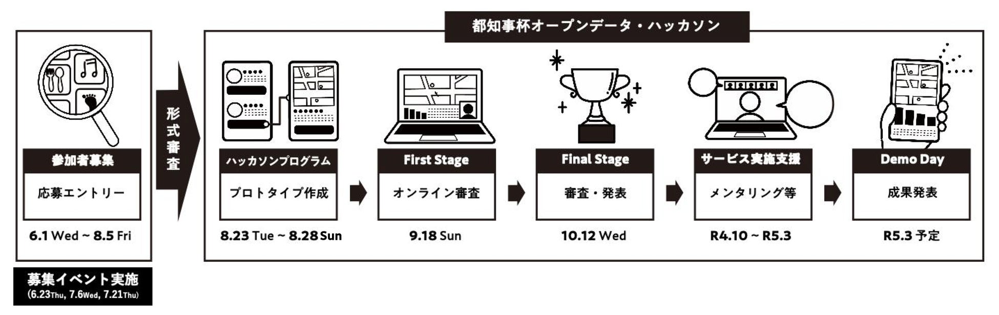 この取組みを加速するため、このたび、東京都のオープンデータを活用して行政課題の解決に向けたデジタルサービスの企画・開発を行う「都知事杯オープンデータ・ハッカソン2022(以下、本事業という)」の参加者募集を本日6月1日(水)より開始しますので、お知らせいたします。