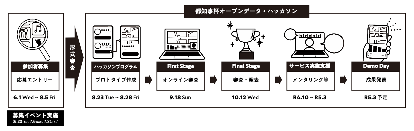内容:参加者は、東京都から提供されるオープンデータを自由に加工し、6日間で都民の利便性を向上させる新サービスのプロトタイピングを目指します。東京都のサポートを受けて制作したプロトタイプを「First Stage」でプレゼンテーションしていただき、その中から「Final Stage」に進出する優秀な10プロジェクトを選定します。「Final Stage」では、審査委員の得点と視聴者投票の得点を合わせ、都知事杯や本年度新設したオーディエンス賞、及び審査員特別賞(4賞)を決定します。10プロジェクトに対し、本年度末までデザインや使い勝手の良い機能のアドバイス、プログラミングの構築等、実装に向けて東京都が支援を実施いたします。ハッカソンを通じて出来上がったサービスについては本年度末の「Demo Day」で成果を発表していただきます。