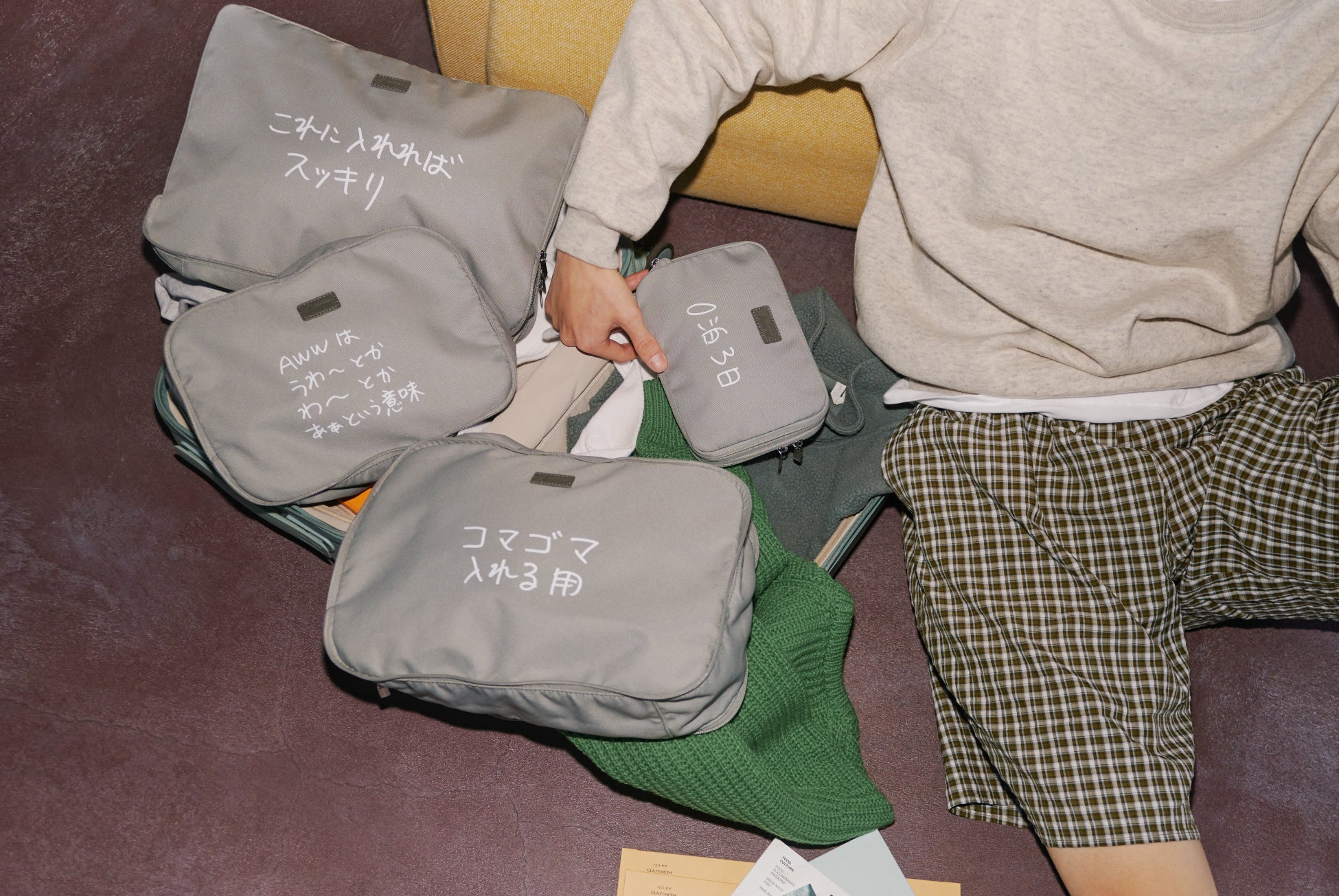 本コレクションでは、パッキングキューブやトラベルポーチなどAwwの人気アイテム4型をベースに、加賀美氏による手書きの言葉を大胆にプリント。「これに入れればスッキリ」「どこに何をしまったかわからなくなった」「トラベルでトラブりたくない」など、旅の途中にふと浮かぶ言葉がプロダクトに添えられています。機能性を追求したAwwのアイテムに、加賀美氏ならではのユーモアが加わり、旅支度の時間にささやかな遊び心をもたらします。