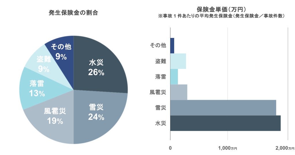 事故内容としては、雪災、水災、風雹災および落雷などの自然災害による影響が大きく約8割を占めています。特に雪災と水災は、保険金単価も大きく、重大な被害が発生しやすい傾向にあります。