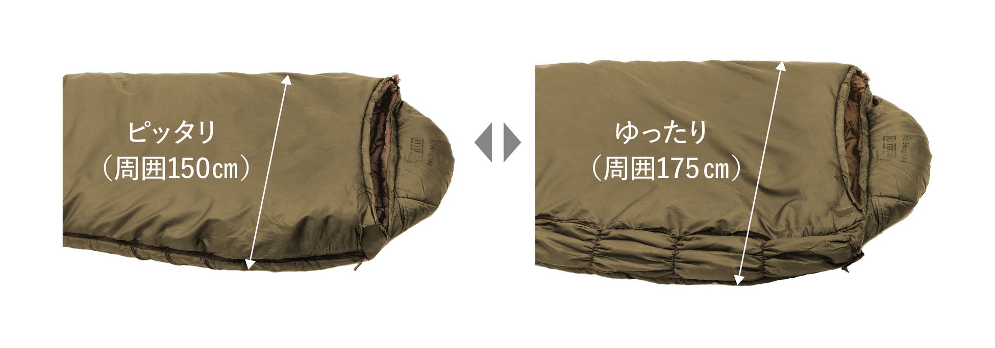 閉めるファスナーを変更するだけで周囲150cmと175cmに切り替え、使う人の体格に合わせて調整する、気温に合わせて空間をあけ快適な温度へ調整することが可能です。