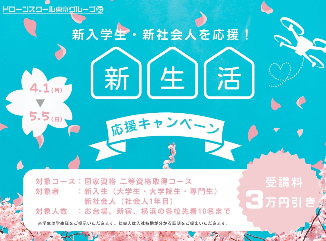 ドローンスクール東京(株式会社ハミングバード:東京都渋谷区、代表取締役:鈴木 伸彦)は、ドローンの国家資格取得を目指す新社会人・新入学生を対象に、2024年4月1日(月)〜2024年5月5日(日)の期間限定でスクール受講費がお得になる『新生活応援キャンペーン』を行います。