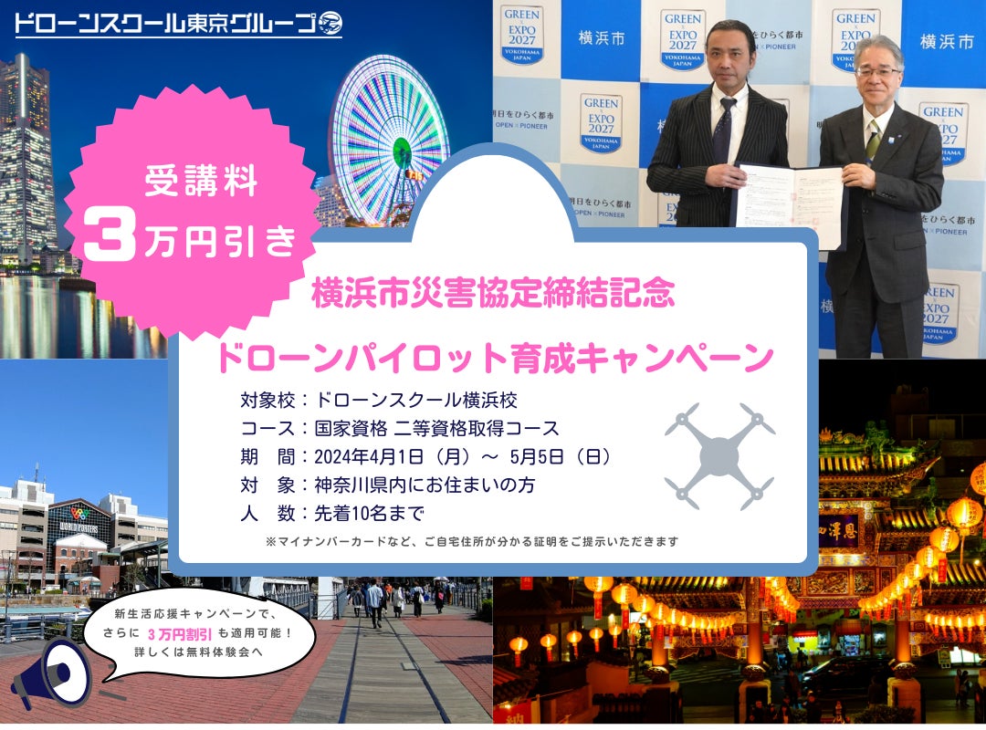 また、2024年3月1日に横浜市と災害協定を締結し、今後は神奈川県内での操縦士育成をこれまで以上に強化したい思いから、神奈川県在住の方向けに二等初学者の受講料が3万円引きとなる『ドローンパイロット育成キャンペーン』も同時開催することに致しました。