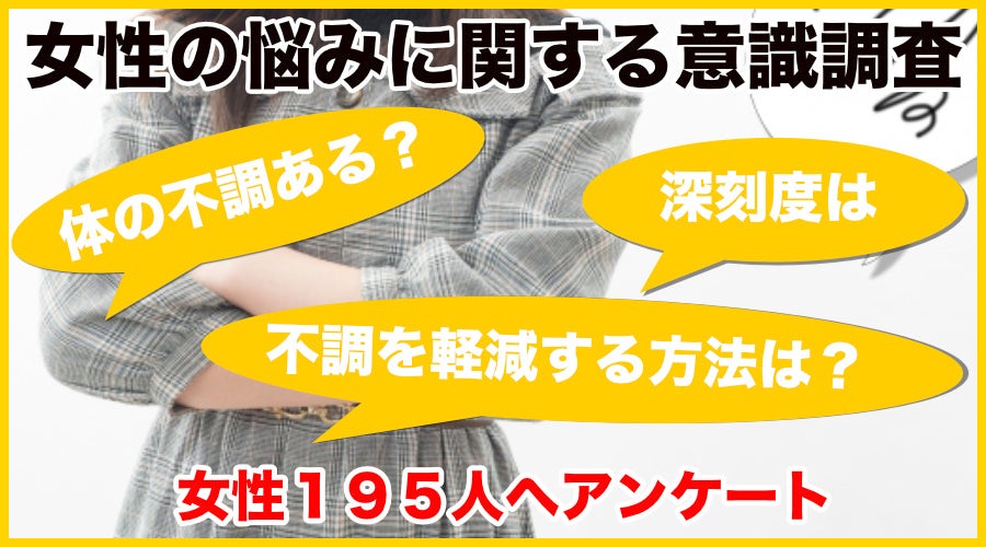 体の悩み・不調を感じているか?、悩み・不調を軽減するためにやっていることは?、自分は他人から悩み事があると思われてると感じるか?など、30代〜50代の女性195人へ意識調査したので紹介します。