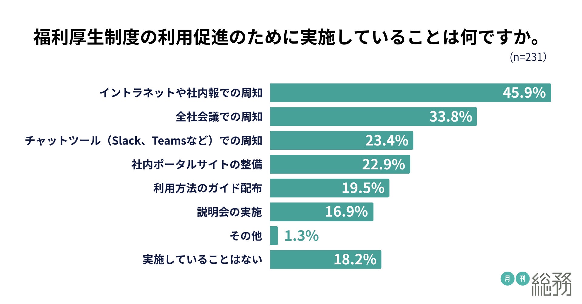 福利厚生制度の利用促進に向けた取り組みについては、「イントラネットや社内報での周知」が45.9%で最多、次いで「全社会議での周知」が33.8%、「チャットツールでの周知」が23.4%と続きました(n=231)。