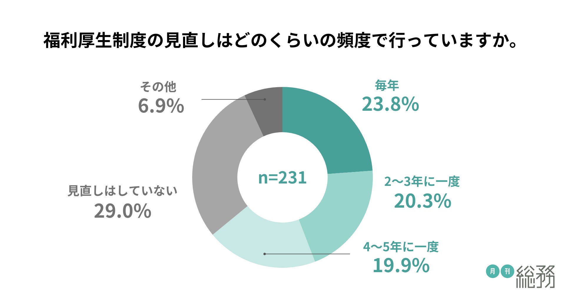 福利厚生制度の見直し頻度について尋ねたところ、「毎年」見直している企業が23.8%で最も多く、続いて「2〜3年に一度」が20.3%、「4〜5年に一度」が19.9%となりました。一方で、「見直しをしていない」と回答した企業は29.0%で、見直しを行っていない企業も一定数存在していることがわかります(n=231)。