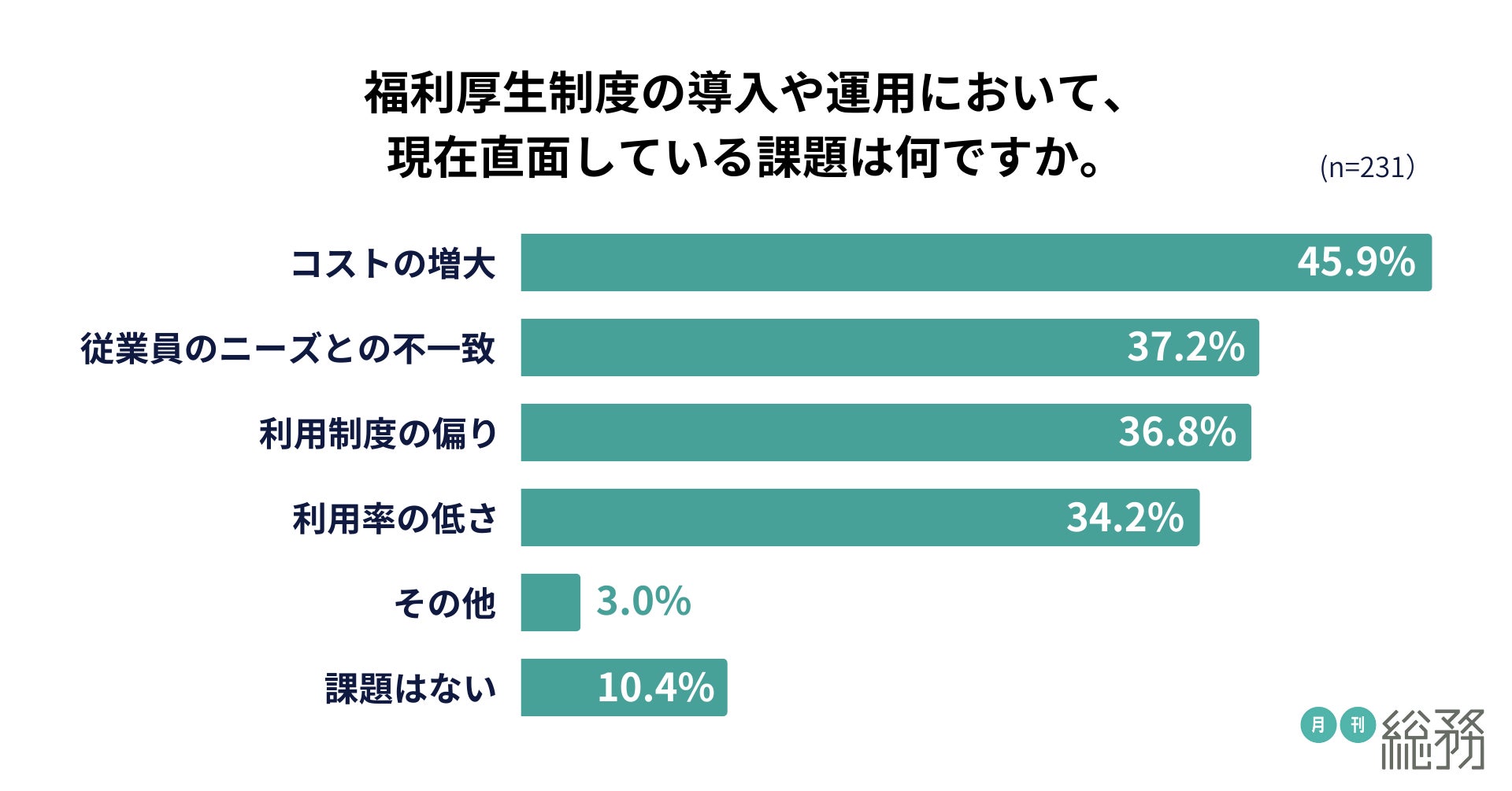 福利厚生制度の導入や運用において直面している課題として、「コストの増大」が45.9%で最も多く挙げられました。次いで「利用制度の偏り」が36.8%、「利用率の低さ」が34.2%、と、福利厚生の効果的な運用にはコスト面や利用状況に課題があることが明らかになりました(n=231)。