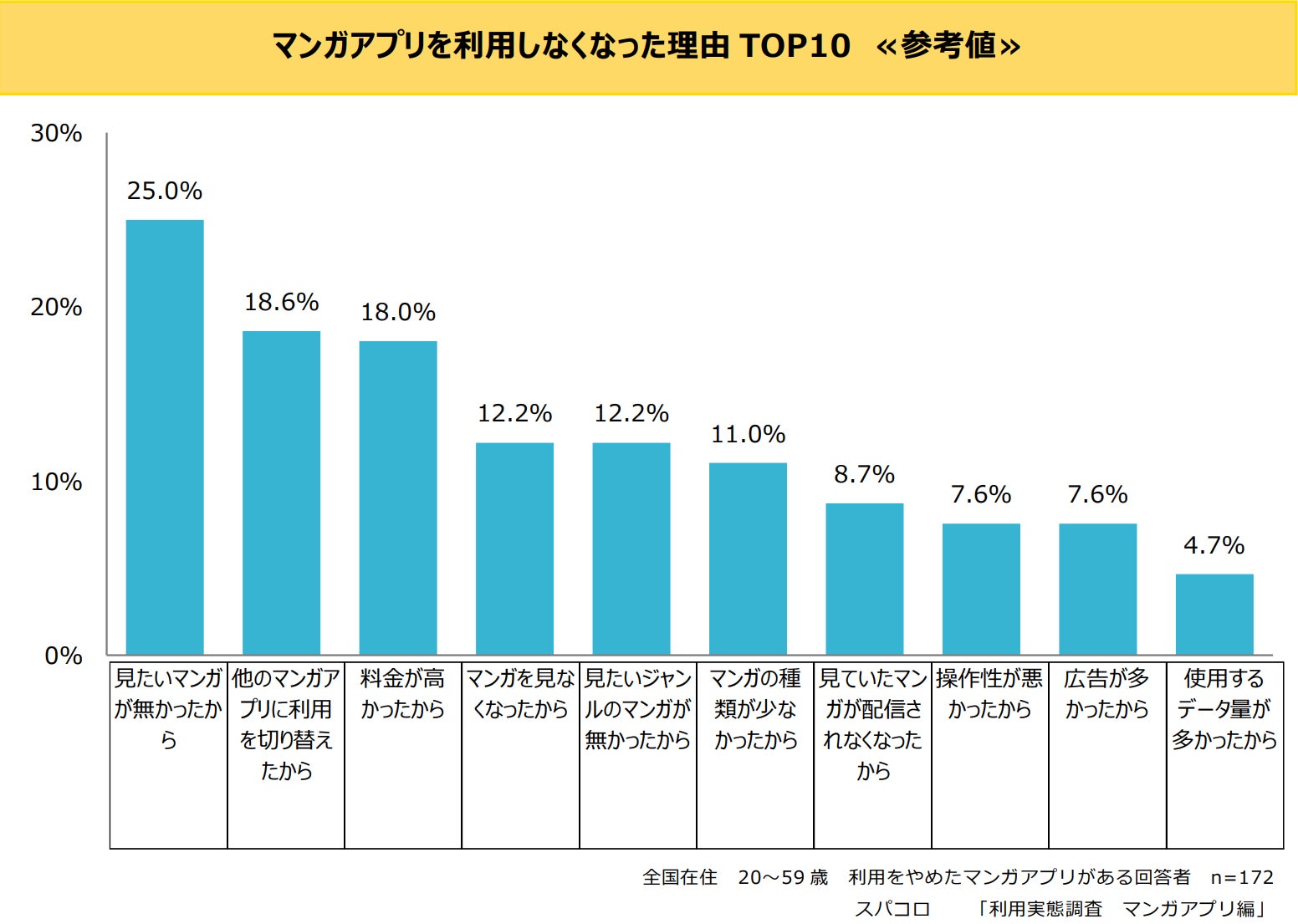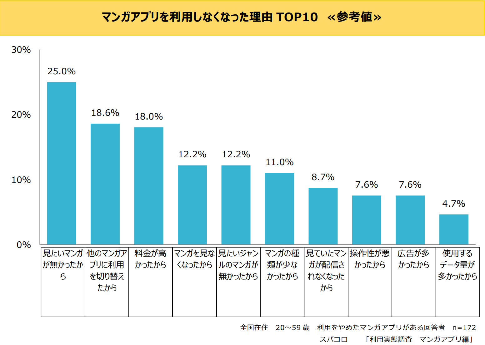 マンガアプリを利用しなくなった理由は上位から「見たいマンガが無かったから」(25.0%)、「他のマンガアプリに利用を切り替えたから」(18.6%)、「料金が高かったから」(18.0%)、「マンガを見なくなったから」「見たいジャンルのマンガが無かったから」(各12.2%)が続いています。