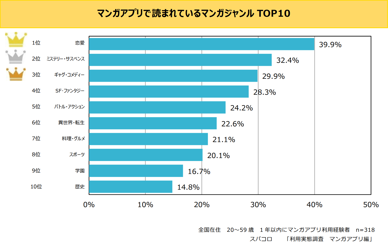 読んでいるマンガジャンルでは1位で「恋愛」(39.9%)。2位以降には「ミステリー・サスペンス」(32.4%)、「ギャグ・コメディー」(29.9%)、「SF・ファンタジー」(28.3%)が続いています。