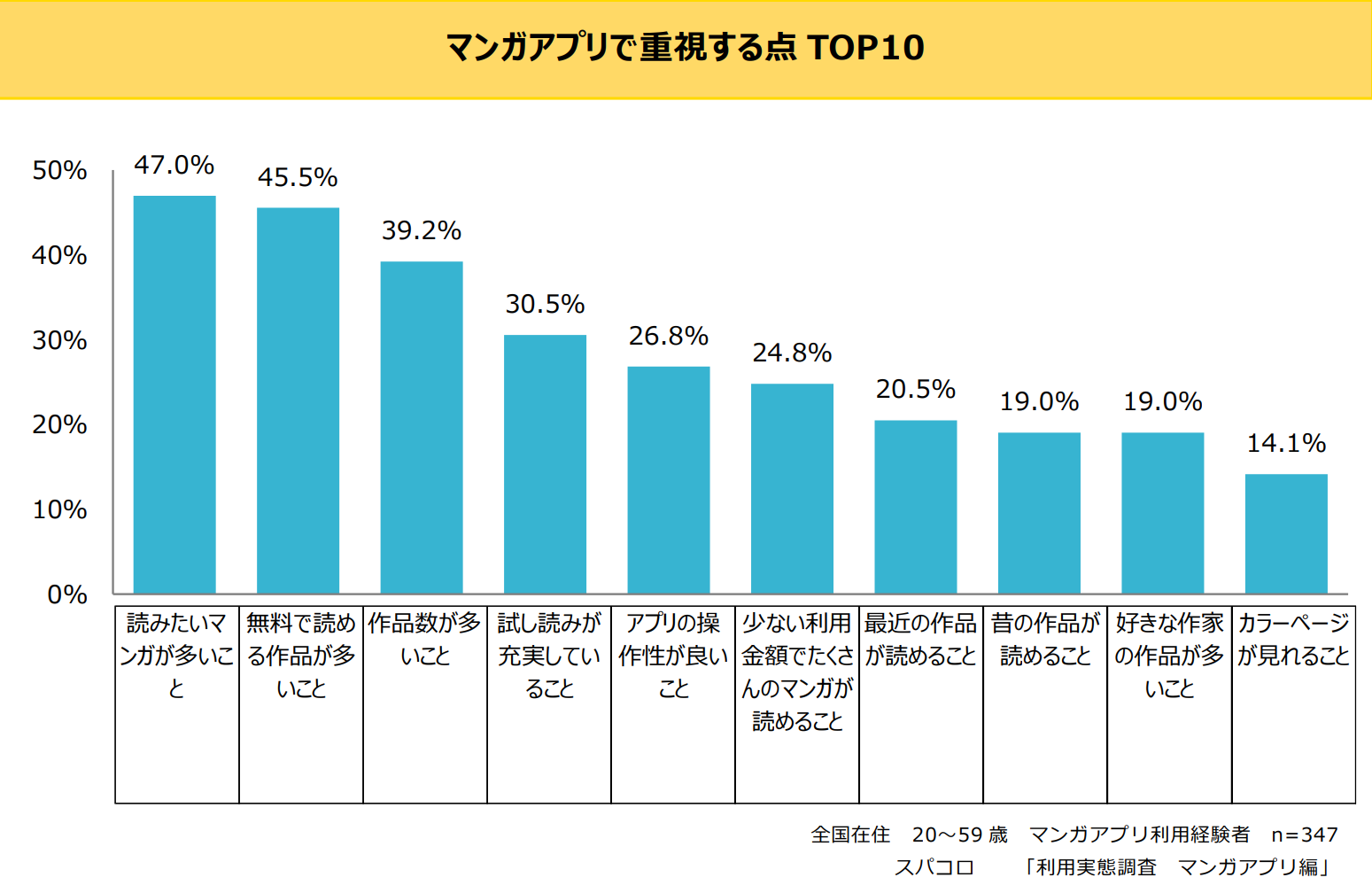 マンガアプリの重視点は上位から「読みたいマンガが多いこと」(47.0%)、「無料で読める作品が多いこと」(45.5%)、「作品数が多いこと」(39.2%)、「試し読みが充実していること」(30.5%)が続いています。