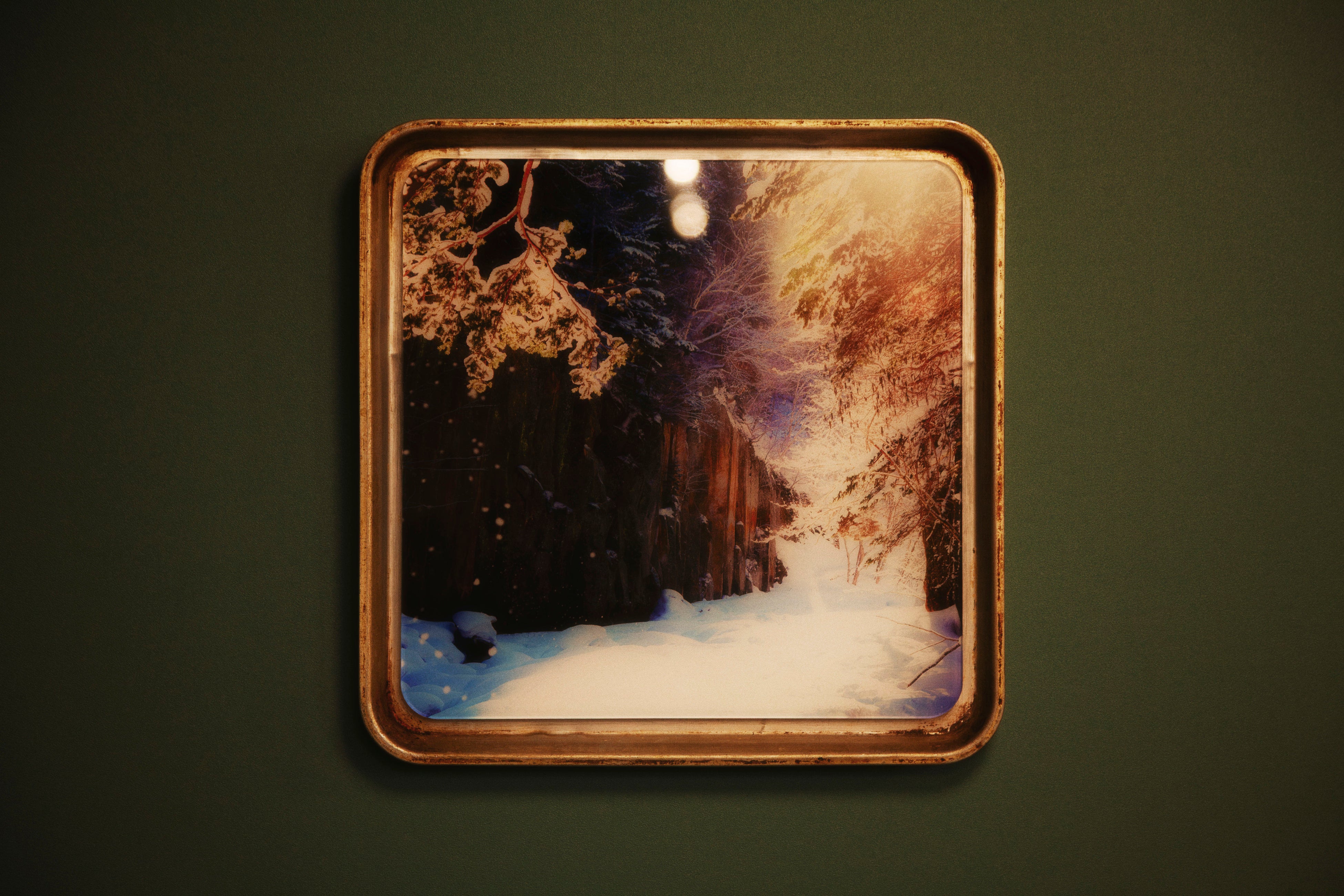 この場にふさわしい写真のたたずまいを考えていた時、ホテル雲井に眠っていた昔のお盆や、私たちをあたためてくれる温泉の桶に出会いました。うつわに張った水が景色をうつし、やがて氷となるように、層雲峡の時の断片を綴じました。