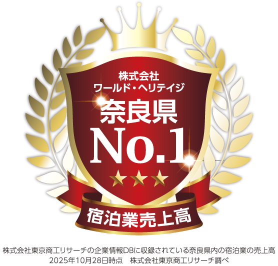2025年10月28日時点の東京商工リサーチの調査において、株式会社ワールド・ヘリテイジは奈良県内の宿泊業における売上高No.1を達成いたしました。今後も、奈良の魅力を国内外へ発信し、皆様に愛される宿泊施設づくりに努めてまいります。