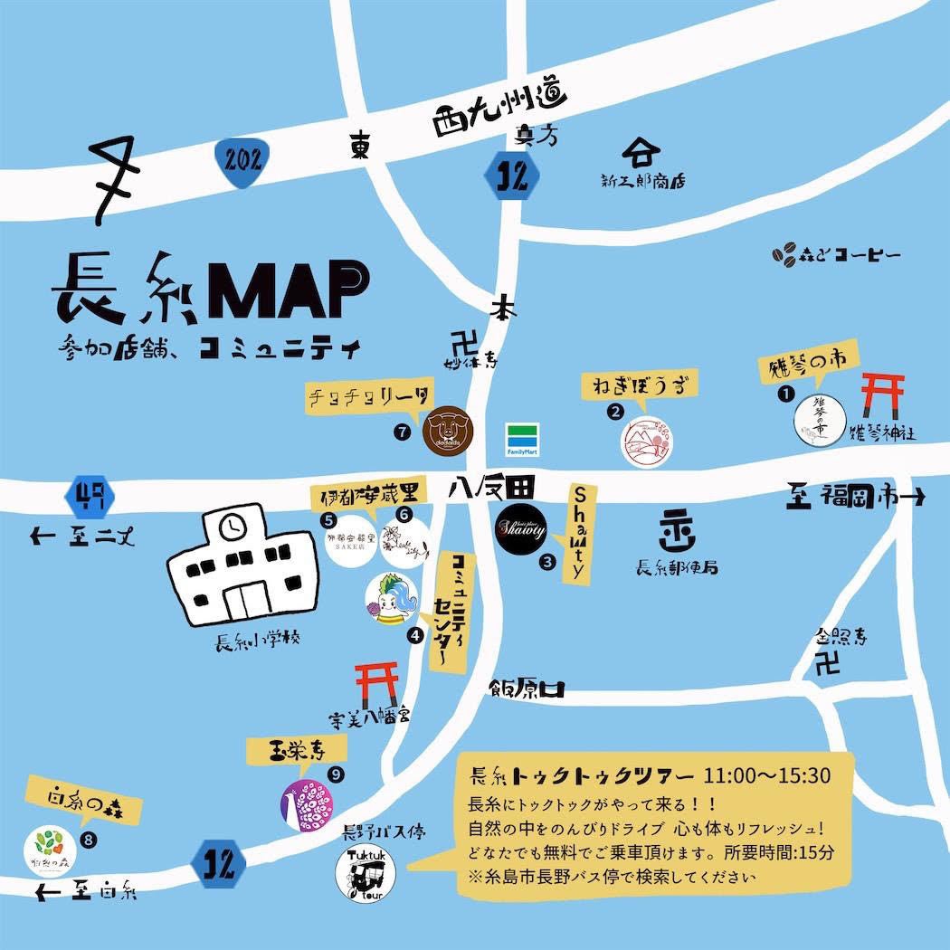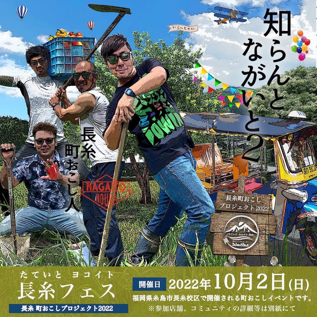 「たていと ヨコイト 長糸フェス」とは糸島市長糸校区の町おこしプロジェクトの一環で、今年で2回目を迎えます。長糸の持つお店や施設・環境というあらゆるロケーションをそのまま「舞台」として設定し、その至る所で様々なジャンルのサービスや商品、パフォーマンスを楽しめるイベントです。