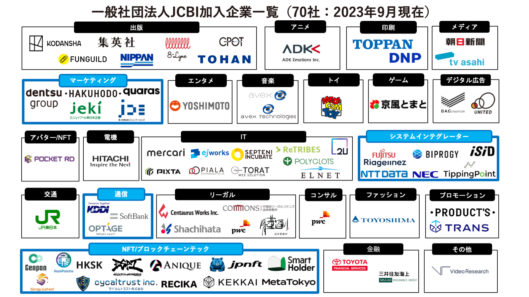 一般社団法人JCBIは、ブロックチェーン等の先端技術を基点として、日本のメディア・コンテンツ業界のデジタルトランスフォーメーションを業界横断で加速するための企業連合です。2020年2月に7社で共同発足したのち、多くの業界各社に加入いただき、今回さらに新たに5社が加わったことにより、加盟企業は70社にまで拡大しました。