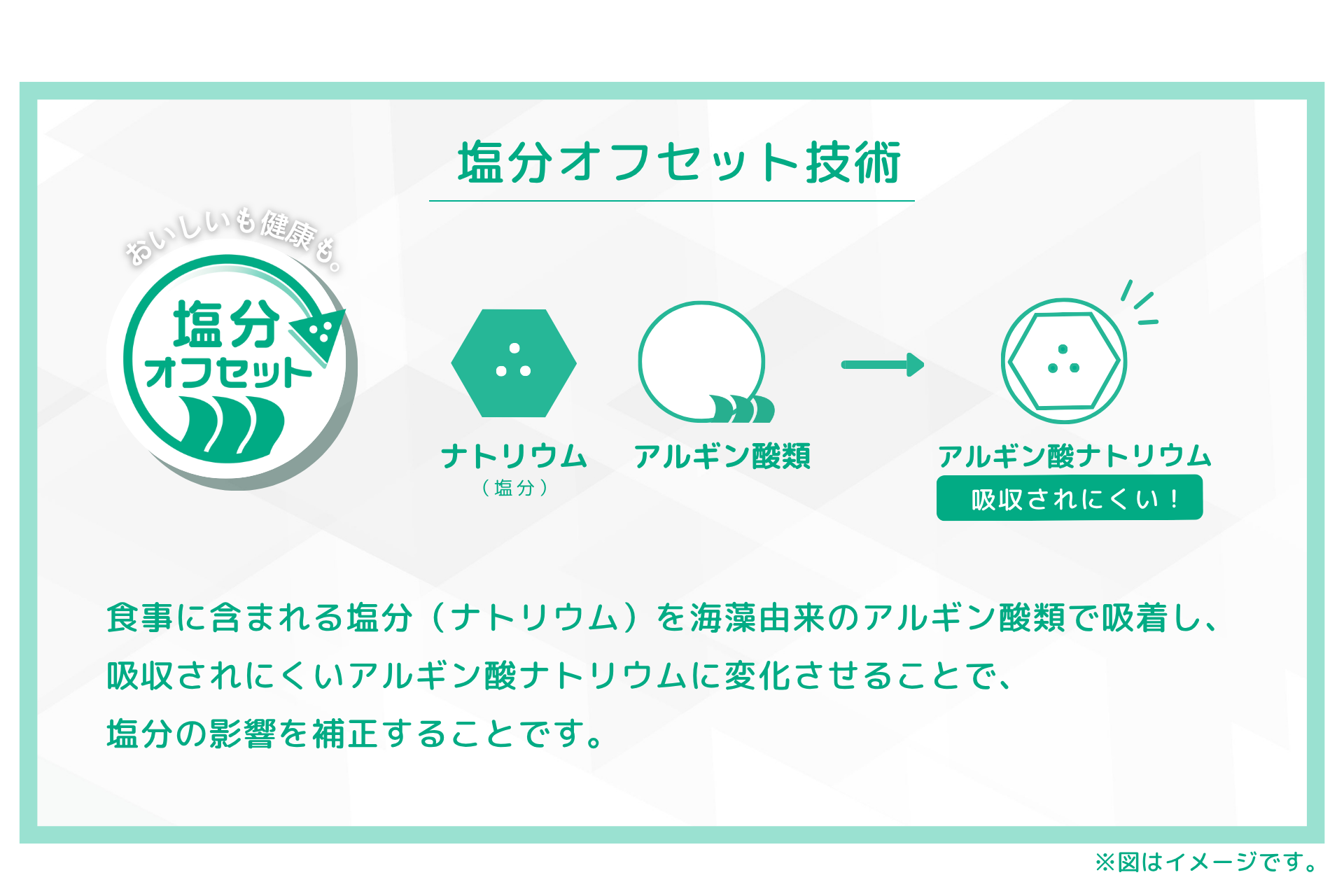 トイメディカルが開発した「塩分オフセット技術」は、海藻由来の食物繊維アルギン酸類を用い、食事中の塩分(ナトリウム)を胃の中で吸着し、吸収しにくい形に変えて、最終的に便として排出するという新しいメカニズムに基づいています。これにより、味を変えることなく、実質的に“減塩”の効果を得ることが可能です。またカリウムを使用していないため、カリウム制限のある方にも安心してご使用頂くことができます。