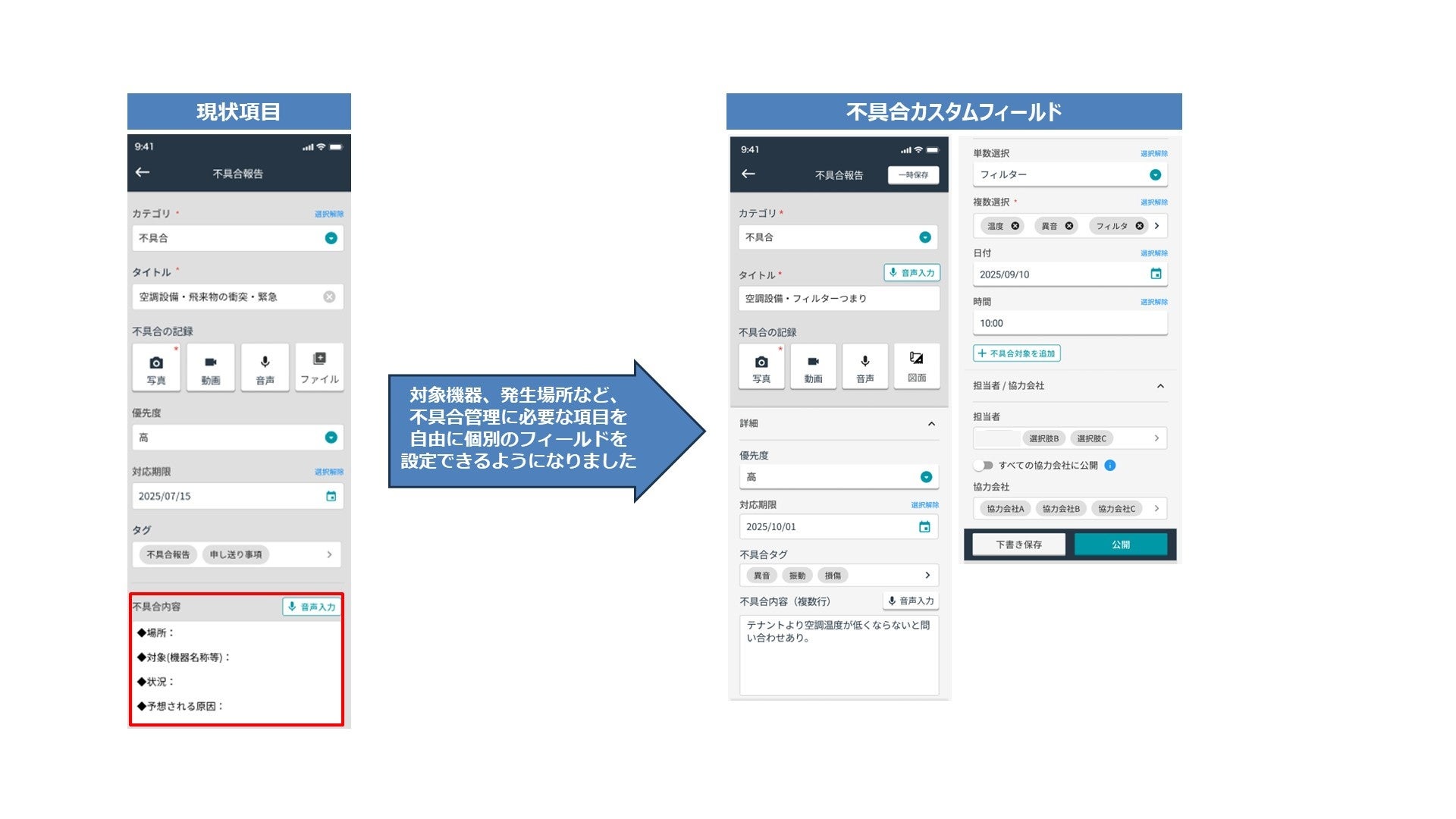 不動産管理業務の労働生産性を改善する株式会社THIRD(本社:東京都新宿区、代表取締役:井上惇、以下、当社)は、AI建物管理クラウドシステム「管理ロイド」において、不具合管理機能を大幅にアップデートし、カスタムフィールド機能を導入します。本機能により、不具合の情報を構造化し、データの正規化を実現します。これにより、AI機能との連動性を上げる事が可能となり、管理ロイドの追加オプションである各種AIオプションが利活用しやすくなります。