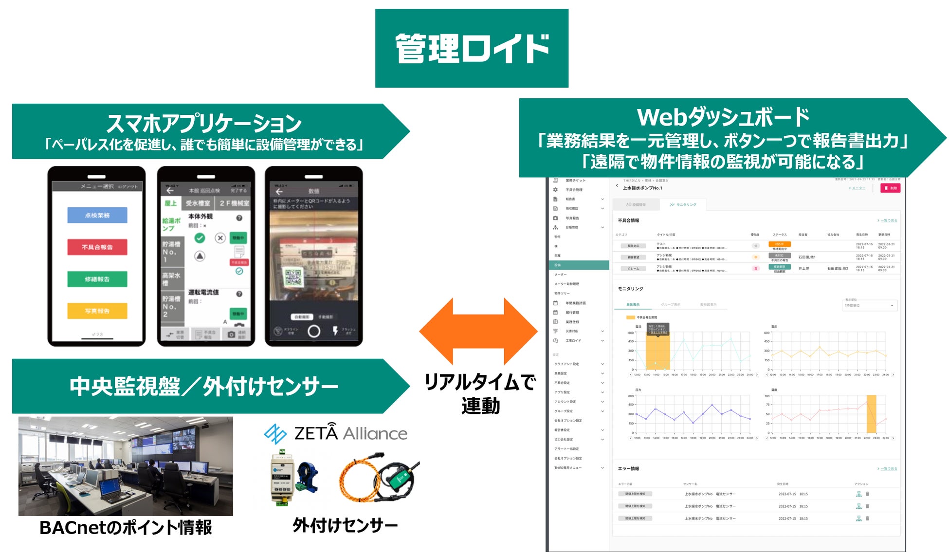 また、中央監視装置や外付けセンサー等のデータを管理ロイドと連携することで、管理ロイド上で物件の遠隔監視を行い、設備管理業務に建物データを利活用することができ、低コストで既存物件をスマートビル化することができる新機能「遠隔監視オプション」もご提供しています。