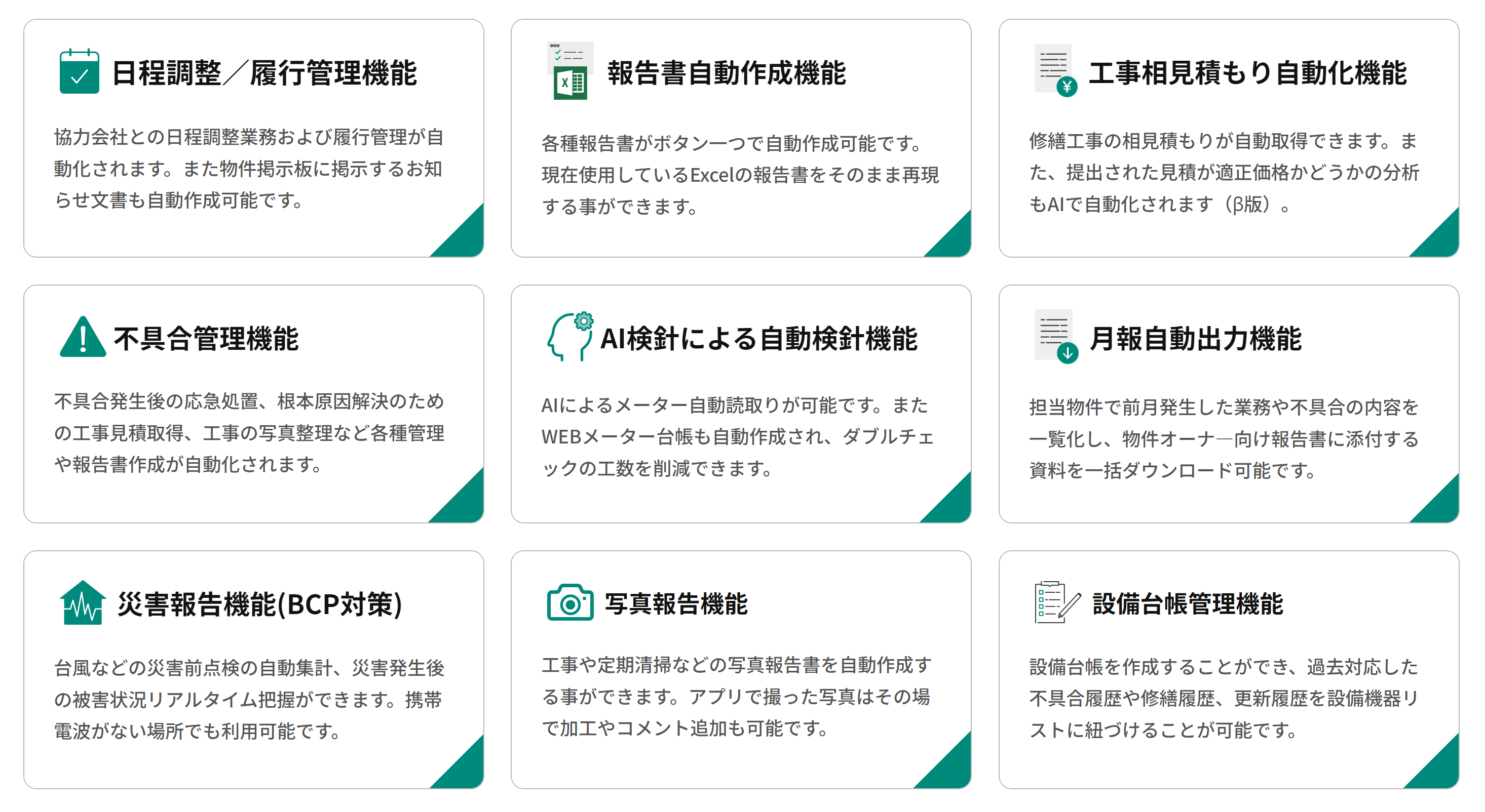 「管理ロイド」は不動産管理会社向けのAI-SaaSソフトウェアです。無料のアプリを使用して点検、検針、清掃報告などの入力を行えば、事務所への帰社後の報告書作成業務が不要になります。これにより、不動産管理実務のペーパーレス化、労働生産性の向上、遠隔確認などが実現できます。紙に起因する単純作業の削減により、労働生産性が向上するとともに、AIを活用した検針ミスの防止や履行管理の一元化により、業務リスクを軽減します。さらに、提出書類のダブルチェックなどをAIがサポートし、不動産管理の品質を向上させます。