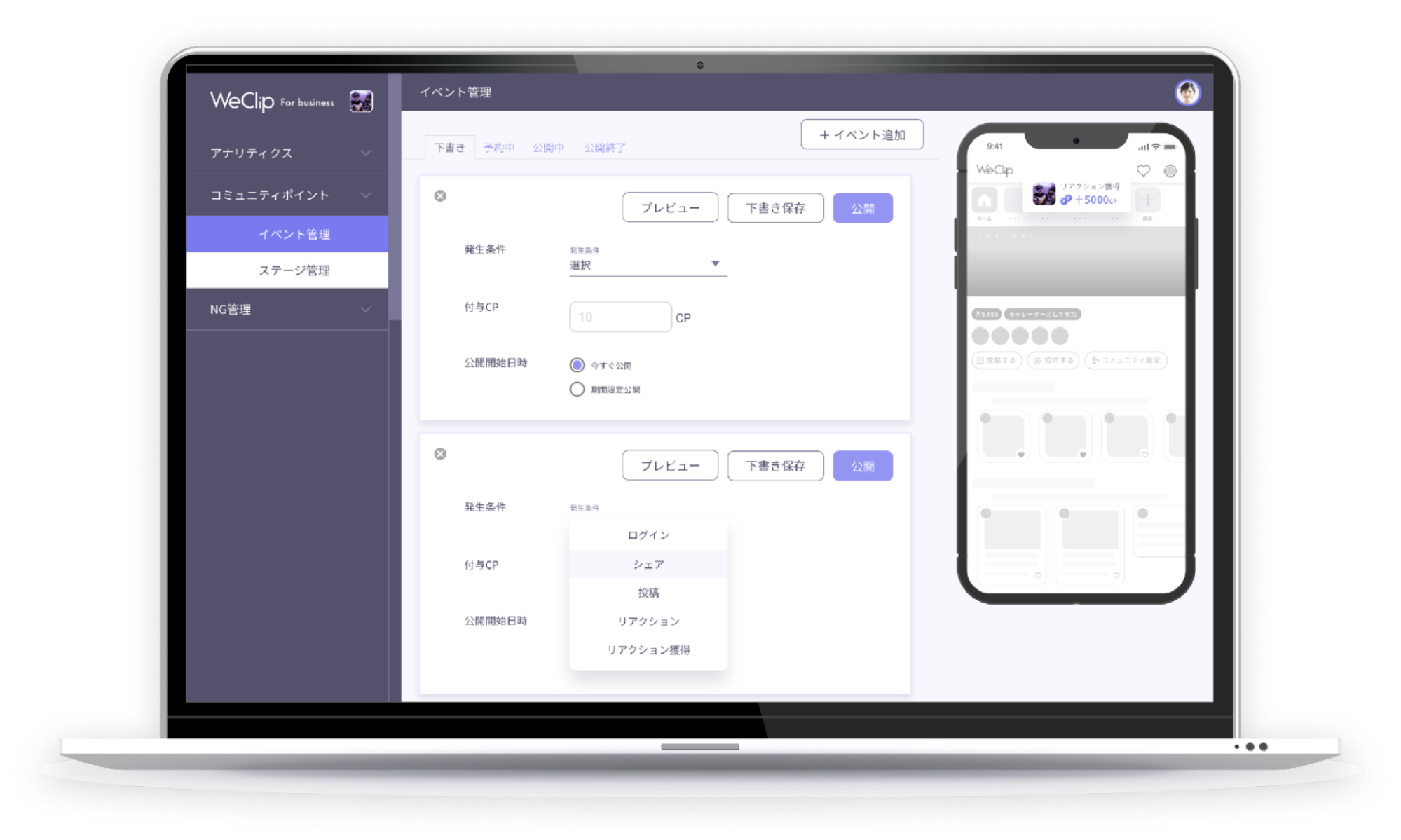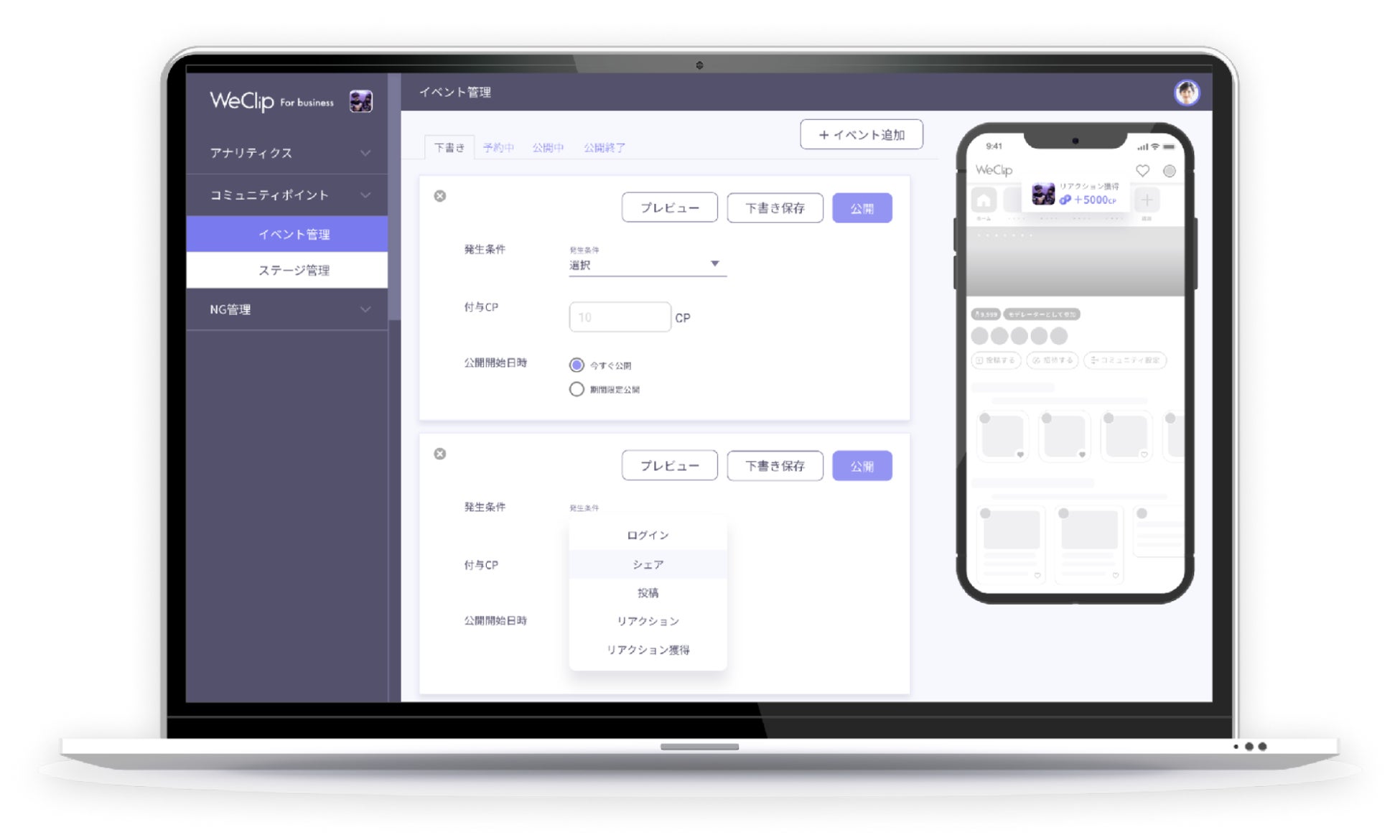 WeClipのビジネス版のプランにはユーザー分析ツールやフォロワーのエンゲージメントを高める機能を多数実装しております。既存ファンが新規ファンを育てる新しいファンマーケティングフレームFRM(Fan Relationship Management)はコミュニティ運営者が円滑にコミュニティを運営するためのツールを利用し、ブランドファンを巻き込んだ長期的な関係構築を実現が可能となっております。