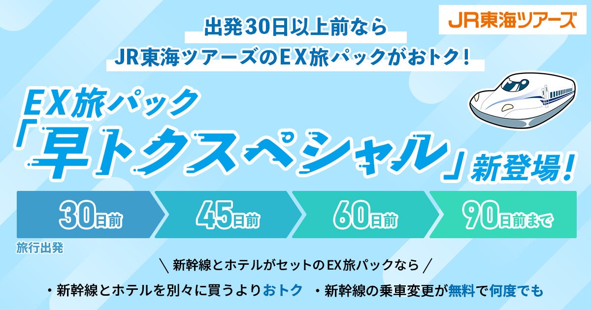 株式会社ジェイアール東海ツアーズ(本社:東京都中央区、以下JR東海ツアーズ)は、2024年9月1日より、新幹線とホテルを個別で予約するよりおトクなEX旅パック(新幹線+ホテル)の新商品として、早期予約でさらにおトクな「早トクスペシャル」を発売いたします。本商品は、30・45・60・90日以上前の旅行予約において、早めに予約すればするほど旅行代金がおトクになる価格にこだわった商品です。