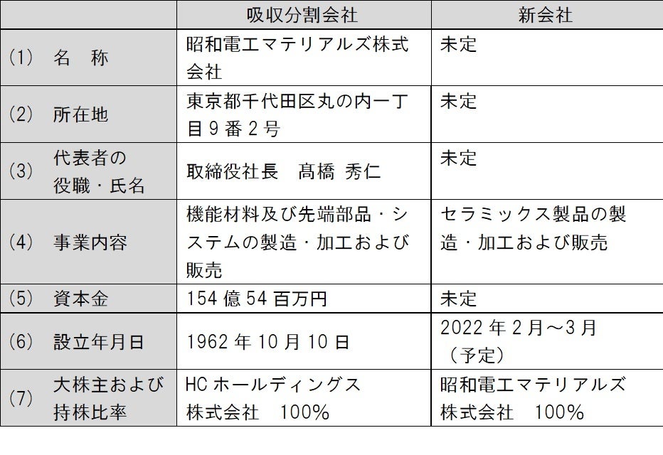 今後、昭和電工マテリアルズは、新たに設立する100%子会社(以下、新会社)に対し、2022年7月1日付で本事業を吸収分割の方法により承継させ、同日付で新会社の株式全てを日本ファインセラミックスが譲り受けることを予定しております。