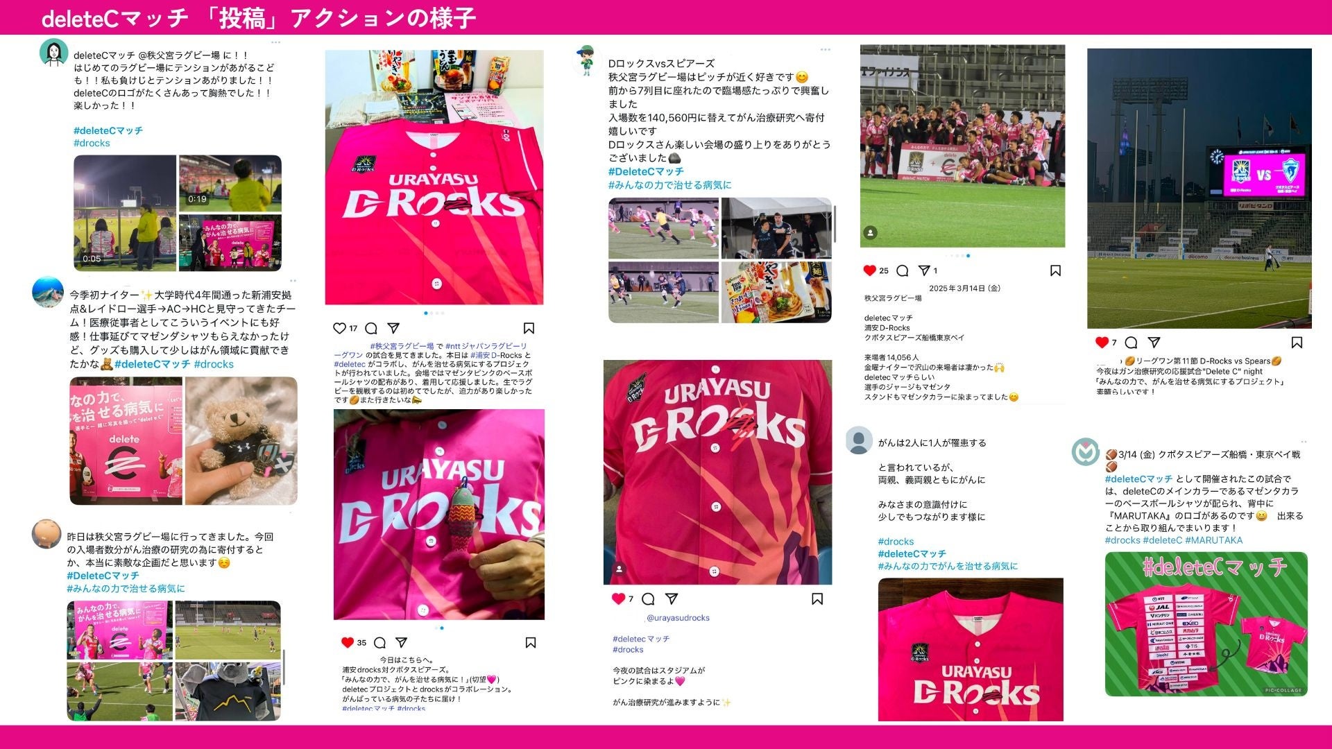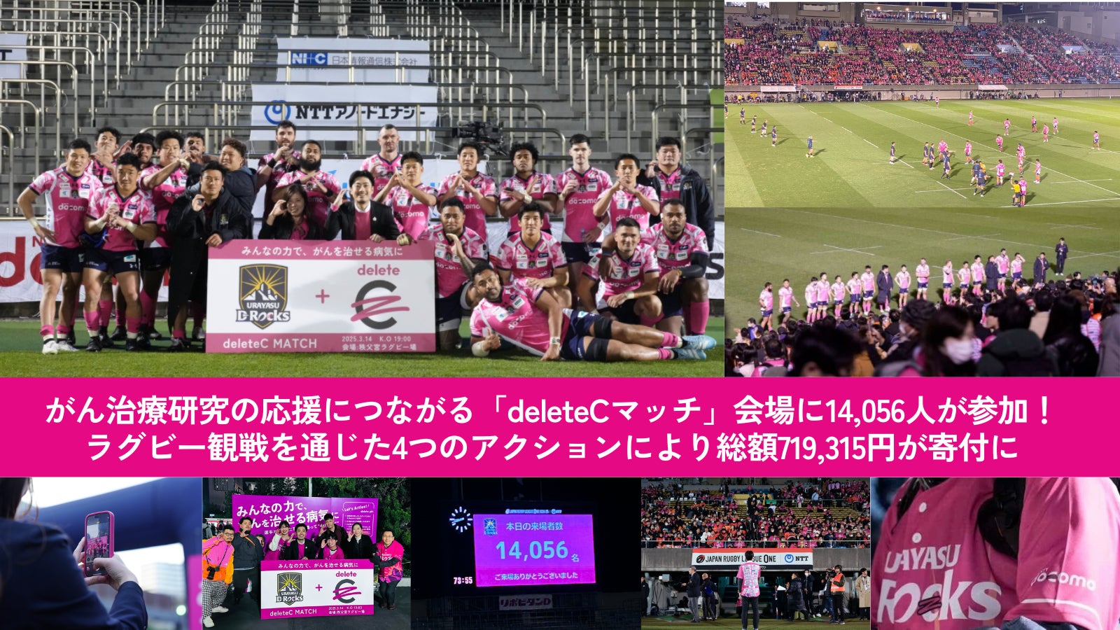 ラグビーチーム 浦安D-Rocks発の企画で、3月14日(金)に秩父宮ラグビー場で行われたNTTジャパンラグビー リーグワン2024-25 第11節のホストゲーム「deleteCマッチ」において、「投稿」「視聴」「来場」「得点」など4つのカジュアルソーシャルアクション(以下、CSA)を通じて、総額719,315円のがん治療研究への寄付があつまったことをご報告します。