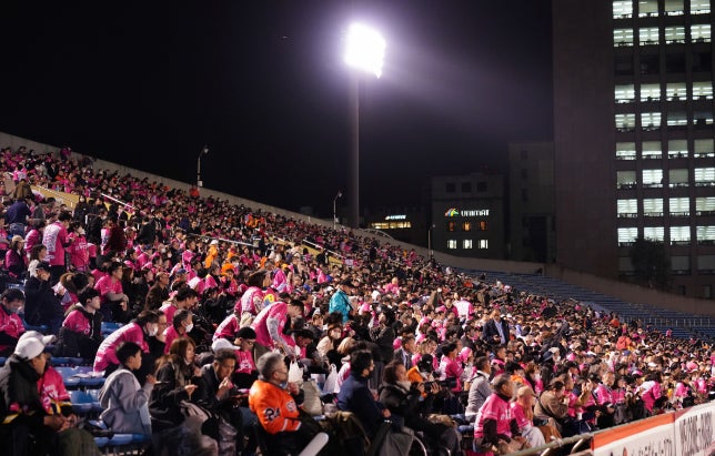 「deleteCマッチ」当日は、会場に14,056名が駆けつけました。選手たちはdeleteCのメインカラーであるマゼンタを基調とし、胸のdocomoのロゴからもCをdeleteした特別なジャージを着用。さらに、来場者にはdeleteCカラーのベースボールシャツが配布され、会場全体がマゼンタ色に染まり、選手、ファンが一体となって、がん治療研究への応援に取り組みました。