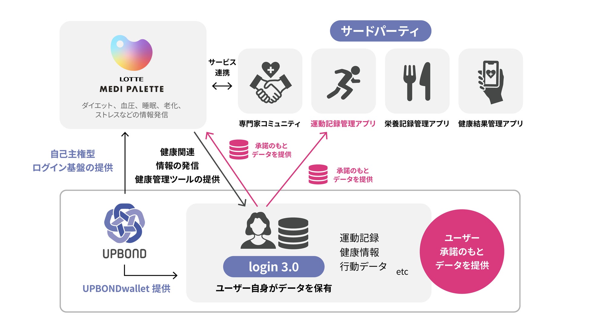 今後、「Medi Palette」では、ダイエット、血圧、睡眠、老化、ストレスなどの情報発信に加え、運動記録、栄養管理記録、健康診断アプリとの連動を予定しています。このため、個人主権型の「Login3.0」を導入することで、ユーザーの個人データは連携先企業に直接提供され、安全にサービスを提供することが可能になり、ユーザーは安心して「Medi Palette」と連携している多様なサービスを利用できます。