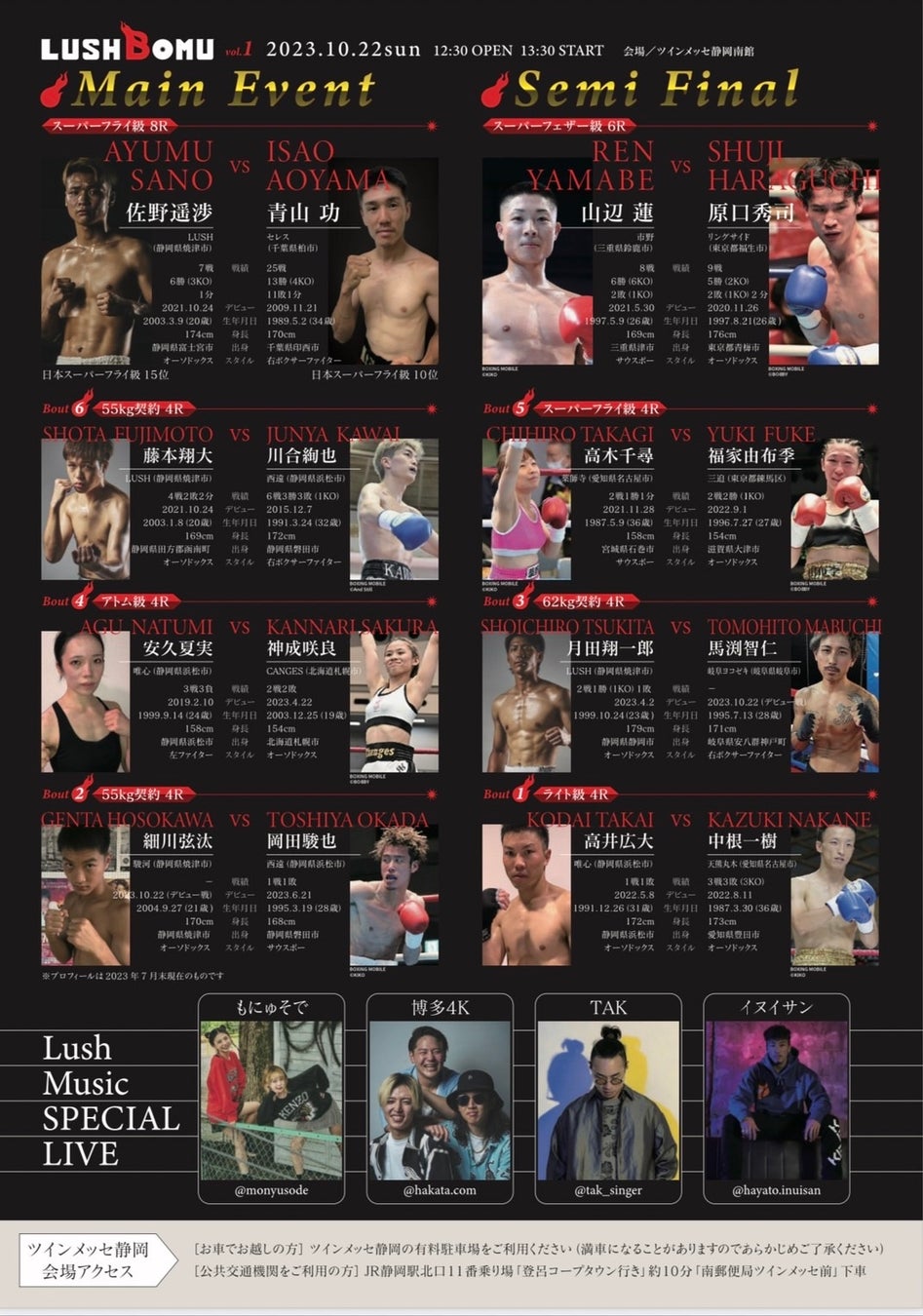 “ボクシングと音楽の融合”という新しいエンターテイメントと銘打って開催する『LUSHBOMU』。vol.1とナンバリングされている通り、静岡から全国、世界へ向けた大型イベントとしての定着化を志し、ボクシング8試合、アーティストたちによるライブステージ、キッチンカーによるグルメの堪能など「楽しんだヤツが、勝者だ。」を合言葉に、来場者の皆様に楽しんでいただけるようなイベントの実現に全力を尽くします。