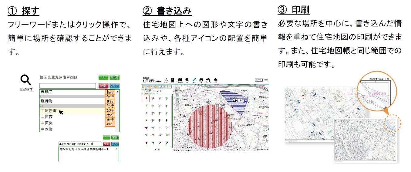 ②専門知識は不要…見る・探す・地図への書き込み・印刷などを、簡単な操作で行えます。