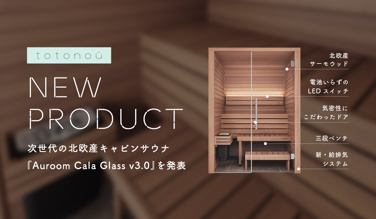 自宅用サウナの国内導入実績トップクラスのtotonou Japan株式会社(本社:東京都渋谷区、代表:齋藤アレックス剛太、以下「totonoü(ととのう)」)は、北欧産キャビンサウナ製品をアップデートした新バージョンとして、『Auroom Cala Glass(オールーム カラ グラス) v3.0』及び 『Auroom Cala Mini(オールーム カラ ミニ) v2.0』を発表します。
