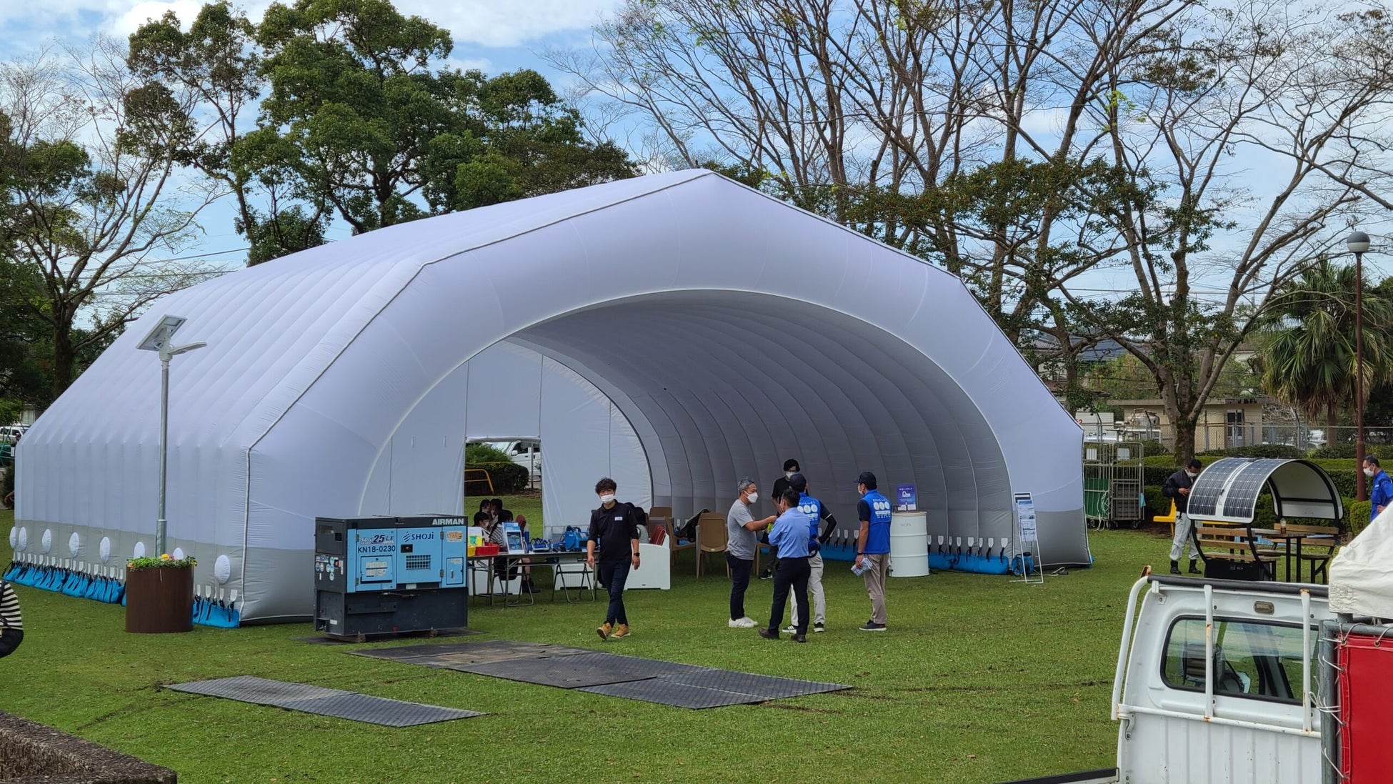 ・誰でも設営が可能なエアーテントによる雨風をしのぐ大規模空間の構築