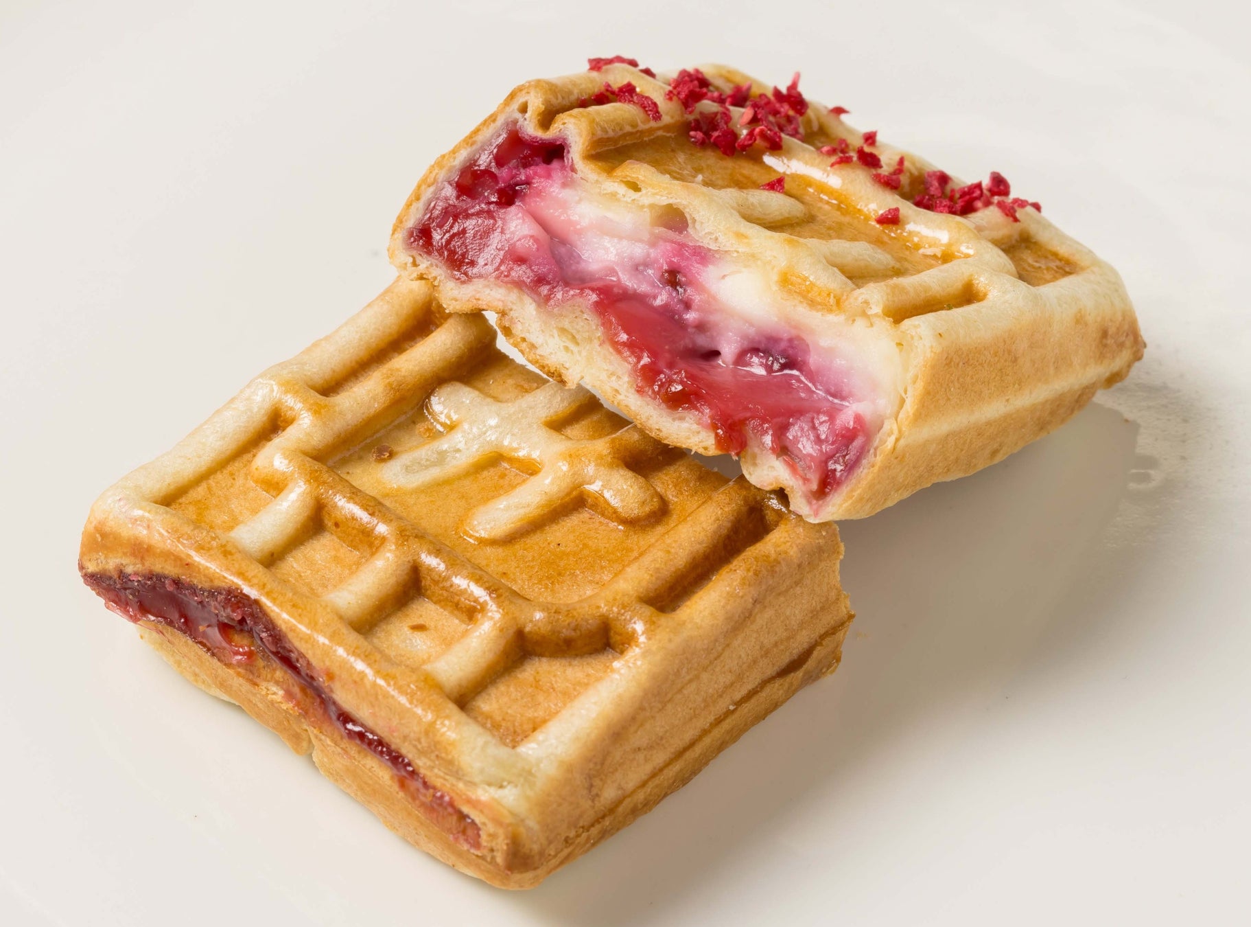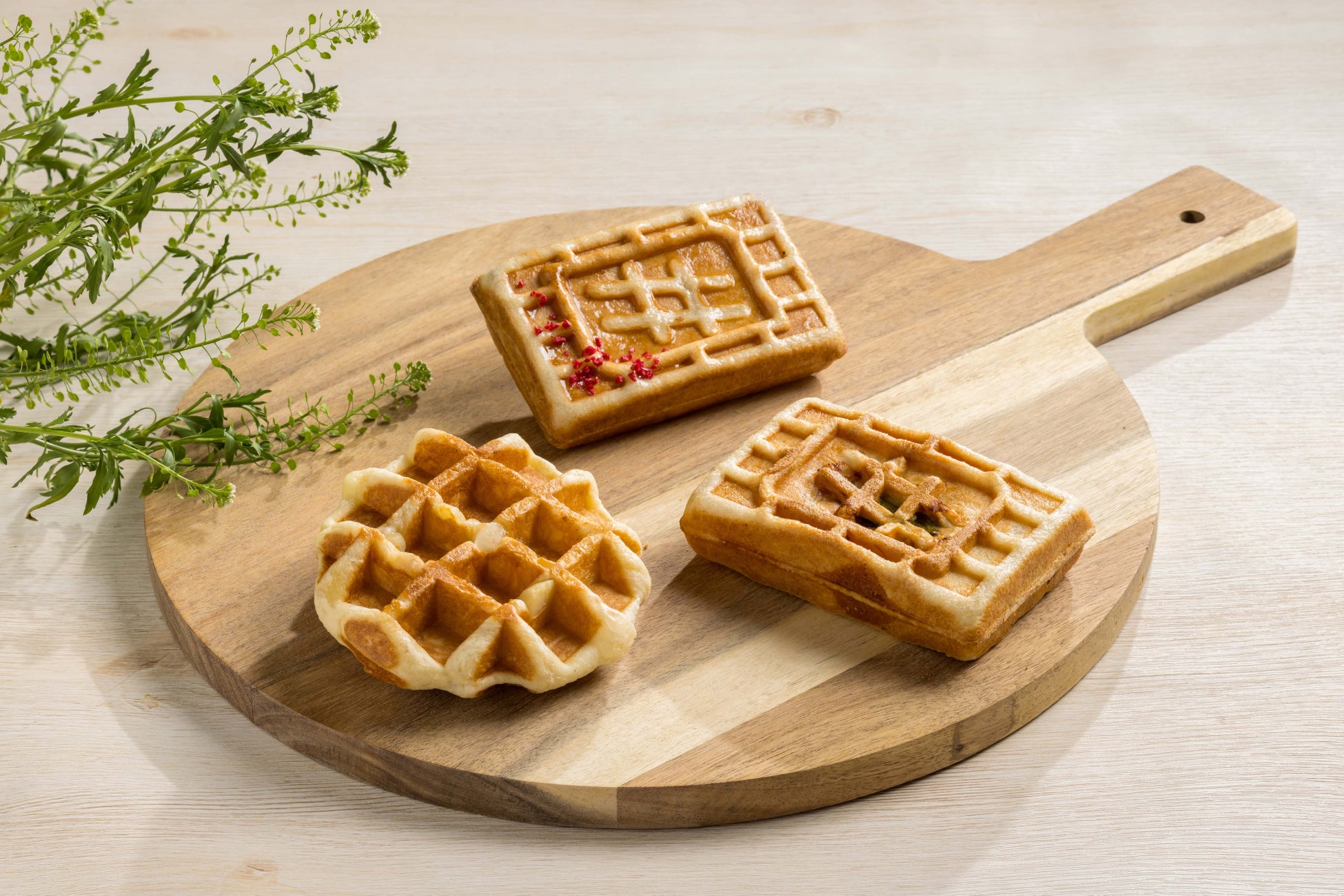 北海道産発酵バターを練り込んだ生地にホワイトチョコチップを包みマカダミアナッツをのせて焼き上げたリエージュワッフル『マカダミア&ホワイトチョコ』、包餡タイプの生地に甘酸っぱいフランボワーズのクリームと果肉、レアチーズクリームを包み焼き上げたハッシュルワッフル『フランボワーズ』、包餡タイプの生地に半熟卵、ベーコンなどをあわせオランデーズソースでアクセントをつけたハッシュルワッフル『エッグベネディクト』の3種類です。商品詳細は次ページをご参照ください。