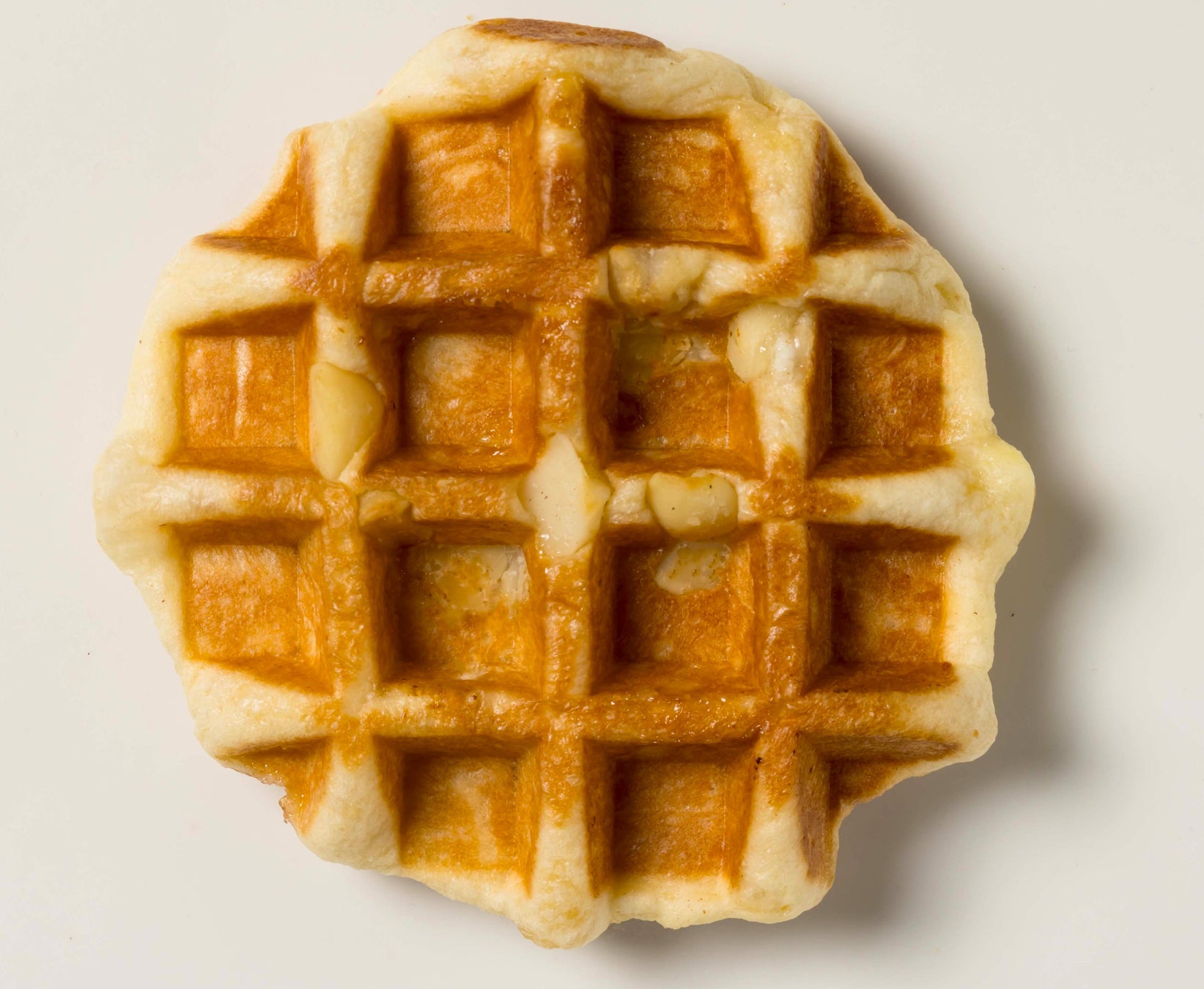 ホワイトチョコチップを包んだワッフルに、マカダミアナッツをトッピングし焼き上げました。