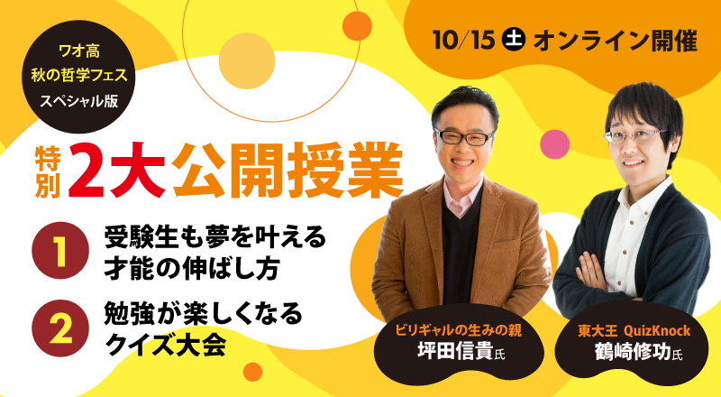 【特別2大公開授業】ビリギャルの生みの親!坪田信貴氏、東大王の鶴崎修功氏 登壇決定!「ワオ高 秋の哲学フェス 2022」スペシャル版 オープンスクール 10月15日(土) 開催!