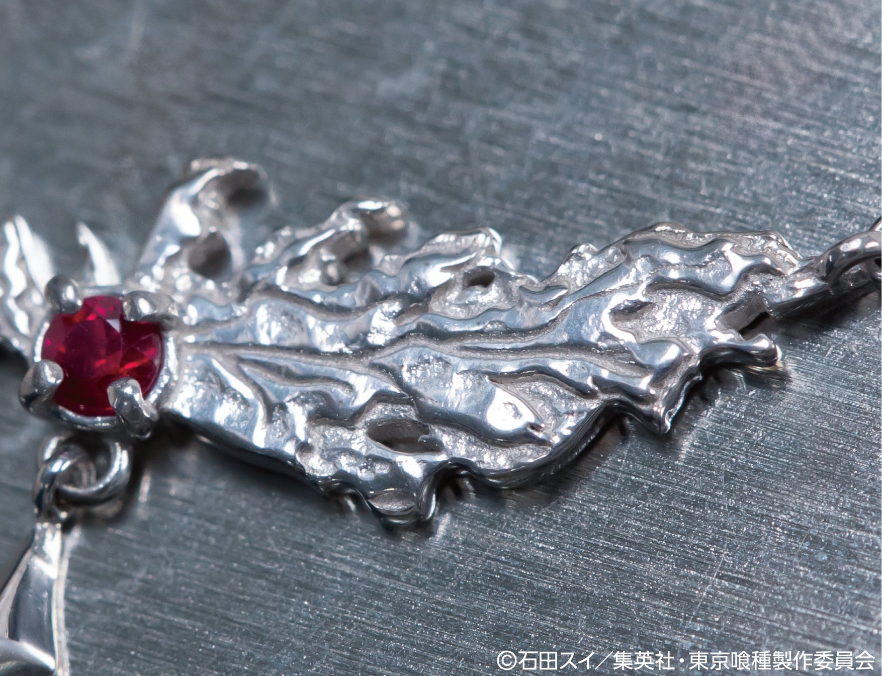 赫包を思わせるように内側にセットされたルビーは、正面から見ると、赫子の根元からのぞき赤く輝きます。
