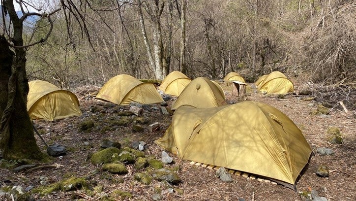 宿泊地となる西沢渡キャンプ場は、大蔵喜福さんが「エコ登山」の推進を目指し設営されたもので、講習を受けたガイド同行者のみ利用できる特別なキャンプ場です。